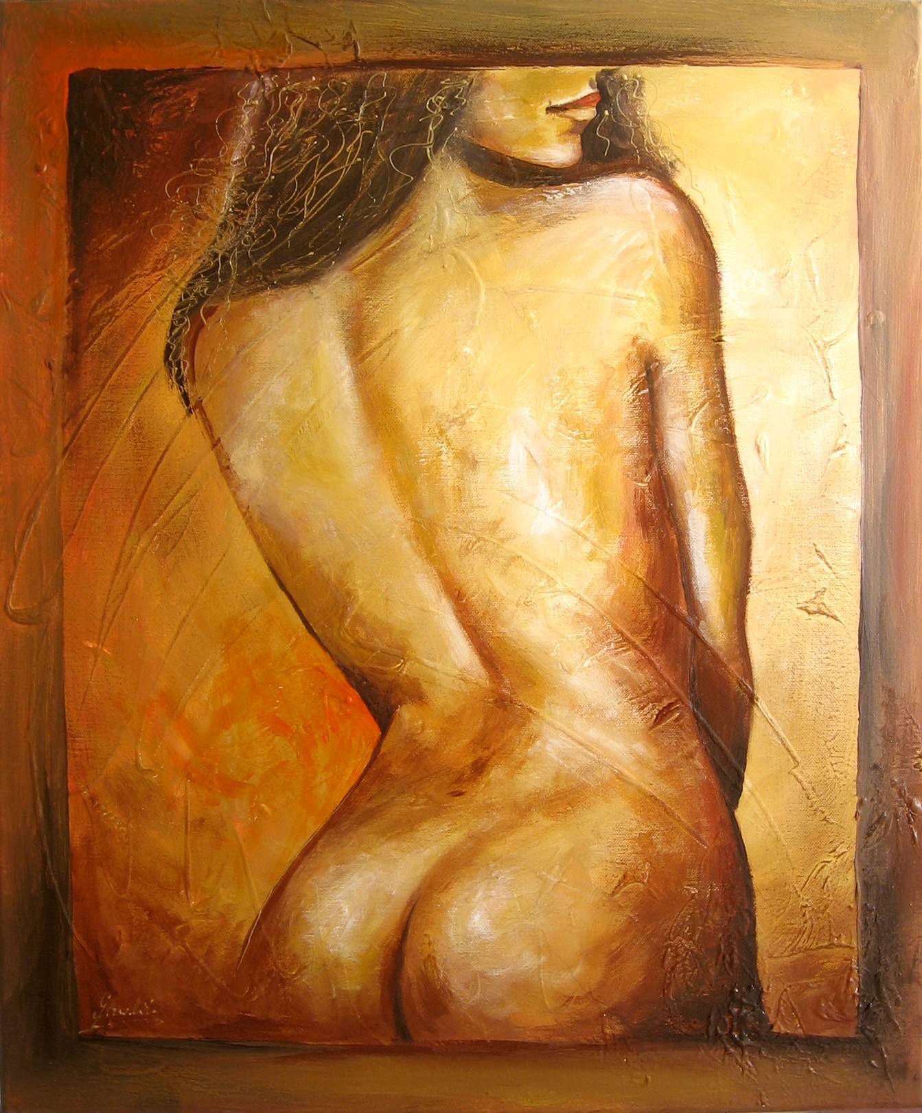Obraz tętni ciepłymi odcieniami brązu i złota, tworząc aurę intymności i spokoju. Dominuje postać kobiety ukazana od tyłu, której krągłe kształty przyciągają wzrok. Artysta umiejętnie bawi się światłocieniem, nadając dziełu głębię i plastyczność. Kompozycja jest harmonijna; subtelne pociągnięcia pędzla tworzą delikatne, prawie taneczne linie. Atmosfera jest niemal magiczna – czy to zachód słońca, który dobija się przez okno, czy może jakaś nostalgiczna chwila, która ulotnie przeminęła. Na pierwszy rzut oka widz czuje spokój, ale po chwili może poczuć coś więcej, jakby odkrył tajemnicę. Styl obrazu to coś między impresjonizmem a abstrakcją. Jest w nim coś z "freedom," co pozwala na swobodne interpretacje i odczucia. Gładkie przejścia kolorystyczne przypominają o miękkości i wdzięku, z jakim autor oddał każdy szczegół. Obraz może wywoływać w odbiorcy różnorodne emocje: od zadumy po podziw i refleksję nad pięknem ludzkiego ciała. "Ale ona jest ładna" – powiedziałby mały Jaś. To dzieło, które intryguje, od którego nie sposób oderwać wzroku. Zastanawiam się, kim była ta kobieta i jaki miała wpływ na artystę. To naprawdę coś więcej niż tylko płótno i farba.