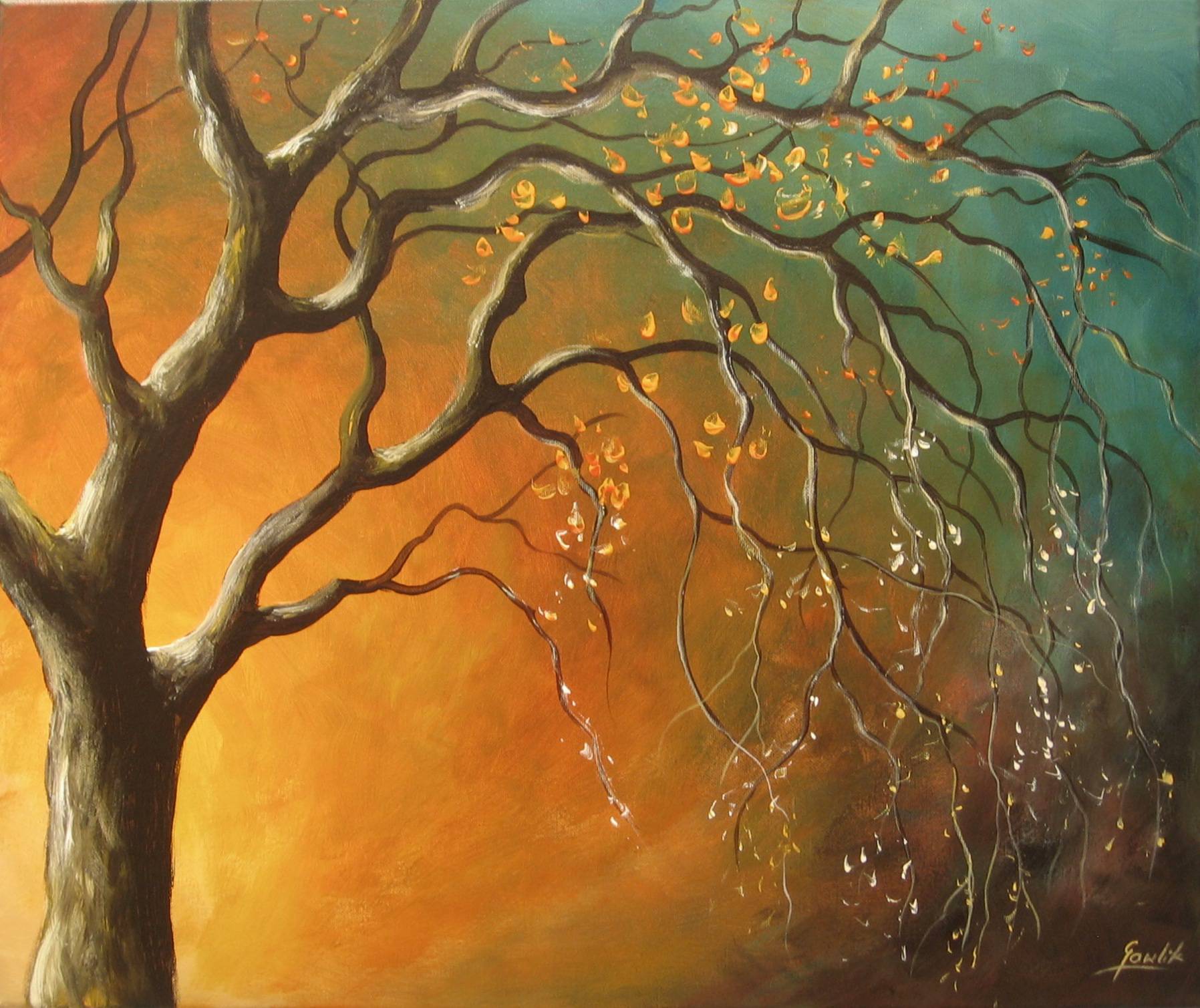 Obraz przedstawia tajemnicze drzewo z poetycką rozkładem jego gałęzi na tle zmieniającego się nieba. Kolory są cudowne i płynne, gdzie ciepłe pomarańcze i głębokie zielenie przeplatają się, tworząc wyjątkowy klimat. Efekt ombre przypomina zachodzące słońce, które delikatnie całuje ziemię. Gałęzie, smukłe i finezyjne, wiją się jak żyły natury. Artysta użył prawdopodobnie technik mieszania farb olejnych, aby osiągnąć takie subtelne przejścia kolorów. To magiczne! Obraz emanuje spokojem, ale jednocześnie niesie za sobą nutę tajemnicy. Jest taki mysterious, a jednocześnie znajomy. Spoglądając na niego, można poczuć melancholię, jakby drzewo opłakiwało coś utraconego. Ale czy to tylko złudzenie? Niektórym może przypominać sen, innym chwilę zadumy nad mijającym czasem. To trochę takie cudowne, że przypomina mi się bajka, którą opowiadała babcia. Światło gra na liściach, jakby iskrzyły się krople rosy. Każdy może znaleźć coś innego, coś własnego w tej kompozycji.