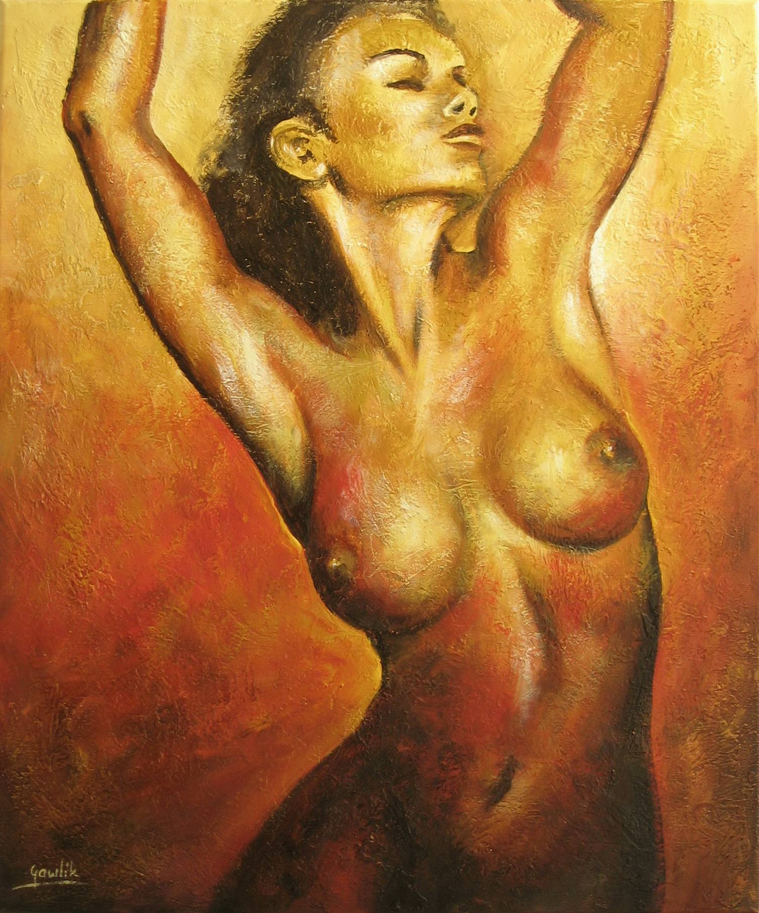 Na obrazie dominuje paleta ciepłych kolorów: od złocistych żółci po intensywne czerwienie, tworzących niezwykle dynamiczny efekt. Kompozycja jest wyrazista, centralna postać przyciąga wzrok swoją ekspresją. Wzrok wędruje po miękko modelowanych kształtach, jakby artysta chciał zatrzymać chwilę w wiecznym ruchu. Atmosfera emanująca z dzieła jest pełna wolności i odwołuje się do zmysłowości, która może wzbudzać różne emocje – od podziwu po refleksję. Styl jest nieco impresjonistyczny, widoczne ślady pędzla dodają tekstury, a grube plamy farby tworzą efekt artystycznego chaosu. Można poczuć się jakby się tańczyło razem z tą sylwetką, tak dynamicznie i z życiem. "Wow, ale super kolory!" – mogłoby powiedzieć 7-letnie dziecko. Zastanawiam się, co artysta chciał nam przekazać tym obrazem. Może to, że życie jest jak taniec, pełne pasji i ruchu? To jest po prostu amazing! Patrząc na to dzieło, mam wrażenie, że słyszę muzykę.