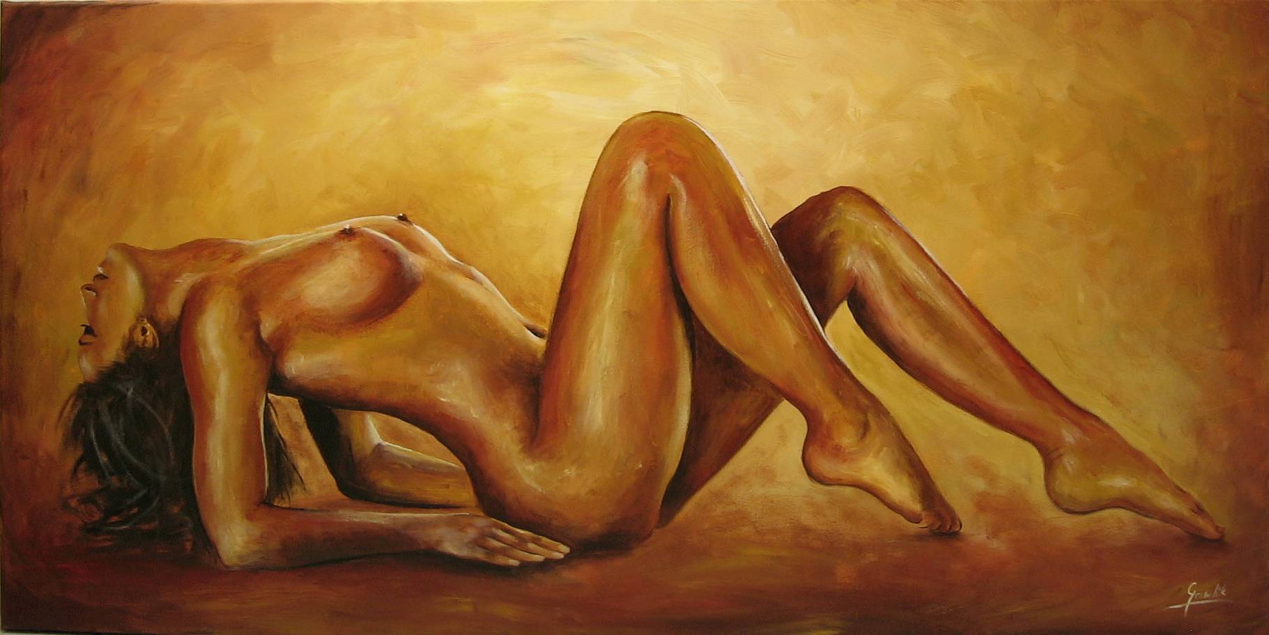 Obraz urzeka ciepłą paletą kolorów, dominują brązy i złote odcienie, które dodają ciepła i intymności. Kobieca postać jest przedstawiona w lirycznej pozie, a miękko zaznaczone kontury ciała płynnie wpisują się w tło. Kompozycja skupia się na dynamice formy, oddając wrażenie harmonii i spokoju. Nastrój jest melancholijny, prawie nostalgiczny, może nawet nieco tajemniczy. Artysta stosuje miękkie pociągnięcia pędzla, technika zdaje się być bardziej impresjonistyczna, nadając całości lekką i eteryczną aurę. Obraz może wzbudzać u widza wiele emocji, od zachwytu nad doskonałością formy po refleksję nad kruchością ludzkiego ciała. Sposób, w jaki figura wtapia się w złocistą poświatę, może przywodzić na myśl wrażenie ciepła i bezpieczeństwa, prawie jak w objęciach słońca. To jest piękne. Myślę sobie, choć ja jestem mały, czy ten obraz opowiada o miłości? Styl malarza jest wyrazisty, wykorzystuje szeroką gamę tonalną, by oddać subtelności i niuanse emocjonalne. Jest tu pewna "softness", delikatność, która czyni obraz wyjątkowym. Obserwując go dłużej, można poczuć głębokie zrozumienie i spokój, co sprawia, że trudno oderwać wzrok. To trochę jak patrzenie w niebo pełne ciepłych promieni.