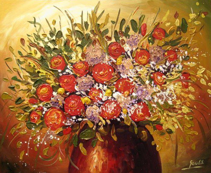 Na obrazie widzimy przepiękny bukiet kwiatów, który aż kipi energią i kolorem. Dominują intensywne odcienie czerwieni oraz pomarańczu, przeplatane subtelną zielenią liści. Kompozycja zdaje się rozkwitać na naszych oczach, kwiaty niemal wyskakują z płótna, wibrując ciepłem i radością. To prawdziwa "feeria barw", które rozprzestrzeniają się niczym promienie zachodzącego słońca. Malarska technika artysty wydaje się być dość swobodna, a zarazem precyzyjna, jakby każde muśniecie pędzla było tu przemyślane. Cieniowanie i faktura przypominają nieco styl impresjonistyczny, choć z nutą ekspresji. Obraz emanuje ciepłem i spokojem, przywołując na myśl letni wieczór spędzony w ogrodzie pełnym kwiatów. Czujesz zapach tych kwiatów? Emocje, które wywołuje to dzieło, mogą być różne: od nostalgii za minionymi chwilami, po czystą, dziecięcą radość. Mamo, te kwiatki są prawie jak z bajki! Obserwując to dzieło, można zatrzymać się na chwilę i zanurzyć w tych ciepłych barwach, odnajdując w nich coś niezwykle osobistego. Pozostawia nas z uśmiechem i uczuciem wewnętrznego spokoju. Naprawdę breathtaking.