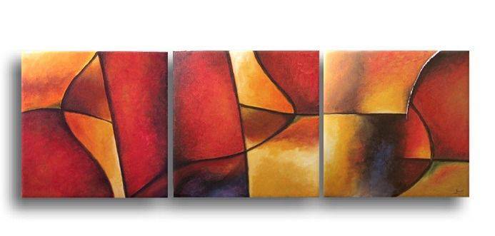 Na pierwszy rzut oka obraz wyróżnia się intensywnymi odcieniami czerwieni, pomarańczu i żółci, które dominują na trzech panelach, tworząc złożoną kompozycję. Kształty są nieregularne, pełne dynamicznych łuków i linii, które zdają się tańczyć na płótnie. Całość przypomina abstrakcyjną mozaikę, gdzie każdy element ma swoje miejsce i znaczenie. Ten obraz to prawdziwy feast dla oczu. Tworzy atmosferę ciepła i energii, ale zarazem nutę tajemnicy. Styl artysty jest niewątpliwie nowoczesny, może nawet trochę kubistyczny, z wyraźnymi wpływami ekspresjonizmu. Techniki użyte to mocne pociągnięcia pędzla i warstwowe nakładanie farb, co daje wrażenie głębi. Obraz może wywoływać uczucia radości, ale też zastanowienia - co właściwie przedstawia? Dla siedmiolatka to mogłoby być coś jak pizza z kółek i trójkątów! Na myśl przychodzi słowo „vibrant” – to przecież wibruje kolorami i emocjami. Patrząc na niego, czuję się jak na granicy dwóch światów - realnego i wyobraźni.