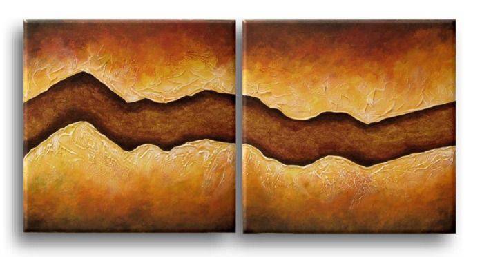 Obraz fascynuje swoim ciepłem kolorów, odcieniami złota, brązów i pomarańczy, które płynnie mieszają się ze sobą, tworząc istną symfonię barw. Centralnym elementem kompozycji jest ciemny, niemal czarny pas, biegnący nieregularnie przez środek obrazu, przypominający głęboki wąwóz lub rozdzierającą ziemię szczelinę. Malunek jest podzielony na dwa panele, co dodaje mu dynamiczności i sugeruje niekończącą się kontynuację krajobrazu. Atmosfera obrazu jest pełna ciepła i tajemnicy. Sprawia, że odbiorca czuje się jednocześnie zaintrygowany i uspokojony. Artysta zastosował technikę impasto, uwydatniając fakturę powierzchni, przez co obraz nabiera trójwymiarowości, niemal chce się go dotknąć. Może przypominać o zmieniających się porach roku, o dynamice natury. Kolory są jak zaproszenie do wędrówki po jesiennym lesie, gdzie każde drzewo ma swoją opowieść. Obraz może budzić refleksje o sile i potędze przyrody, a także o kruchości ludzkiego życia w obliczu tych żywiołów. Jak to dzieło cię dotyka? Czy czujesz ten gorący klimat jak podczas kanikuły? Wow, jesteśmy w magicznym świecie, gdzie czas się zatrzymał, a ziemia opowiada swoje sekrety. Kompletnie lost w tej wspaniałej mieszance barw i kształtów! A może dziecko powiedziałoby: "To jest jak lawa, co się wylała na dwie strony!" Prosty, ale trafiony punkt widzenia. Obraz inspiruje do myślenia o ludzkiej kondycji i pięknie natury.