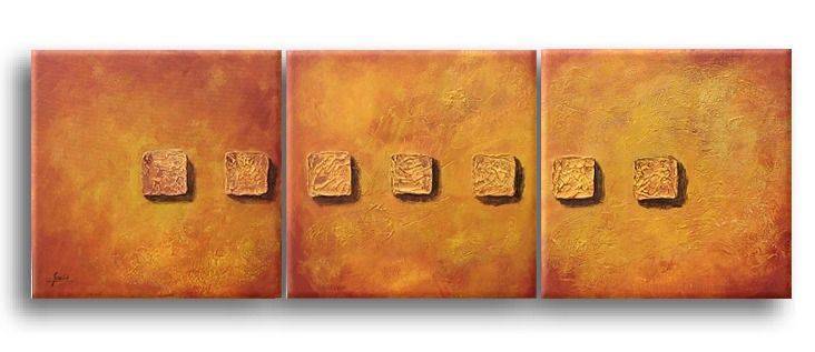 Na obrazie widzimy trzy panele, na których dominuje ciepła gama barwna, głównie odcienie pomarańczu i złota. Na każdym panelu widać prostokątne formy, które wydają się być lekko uniesione, jakby zapraszały do dotknięcia. Kolory są nasycone, a faktura dodaje im głębi, co przyciąga wzrok i prowokuje do dłuższego zastanowienia się nad ich symboliką. Atmosfera obrazu jest intrygująca, trochę nostalgiczna, jakby przypominała o długich jesieniowych wieczorach przy kominku. Styl artysty można określić jako nowoczesny, z wyraźnym naciskiem na abstrakcję i teksturę. Techniki użyte przez artystę sprawiają, że powierzchnia obrazów wydaje się niemal trójwymiarowa. Obraz może budzić różne emocje. Może wywoływać uczucie ciepła i spokoju, a jednocześnie nieco tajemniczości, gdy zastanawiamy się nad znaczeniem tych form. Jeden widz może zobaczyć w nich drogę, inny – czyjeś myśli ułożone w porządku. Wow, to wygląda jak wielka gra z klockami – powiedziałoby dziecko. Personalnie, czuję lughtness (lekkość) patrząc na te kształty. Przypominają mi letnie dni pełne słońca. Też zauważam, że każdy z elementów zdaje się mieć swoją indywidualną historię. Ciekawe, jak różne osoby mogą je różnie interpretować.