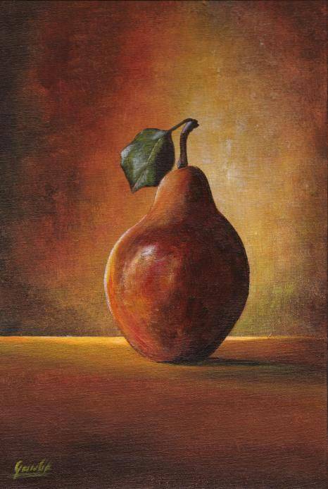 Obraz przedstawia klasyczną martwą naturę z dominującą gruszką na pierwszym planie. W kolorystyce przeważają ciepłe odcienie brązów i złota, które podkreślają głębię i teksturę owocu. Tło jest subtelnie rozmyte, co sprawia, że gruszka wydaje się niemal trójwymiarowa i wysuwa się na pierwszy plan. Światło jest miękkie, odbija się delikatnie na powierzchni owocu, podkreślając jego kształty i nierówności. Kompozycja jest prosta, ale bardzo harmonijna. Artysta zastosował technikę impasto, co dodaje obrazu wyrazistości. Atmosfera obrazu to spokój i ciepło. Mamy wrażenie, jakbyśmy siedzieli przy stole w słoneczne popołudnie. Ta harmonia wywołuje uczucie nostalgii i przypomina o prostych przyjemnościach życia. Słowo "stillness" idealnie oddaje ten nastrój. Styl artystyczny nawiązuje do realizmu, ale z nutą impresjonizmu. Pociągnięcia pędzla są widoczne i dynamiczne, co dodaje życia tej statycznej scenie. Patrząc na obraz, można poczuć spokój i zastanowić się nad ulotnością chwili. Może to być zaproszenie do refleksji nad pięknem codziennych przedmiotów. "Gruszka jest jak skarb", pomyślałby mały chłopiec, zastanawiając się, dlaczego coś tak prostego może być tak piękne. Dla mnie ten obraz to małe codzienne arcydzieło, które za każdym razem odkrywa nowe tajemnice.