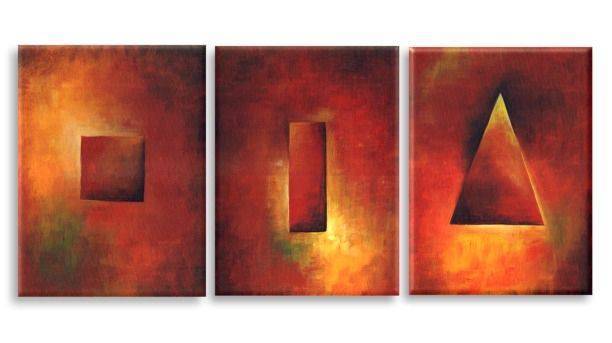 Obraz składa się z trzech paneli, każdy z nich ożywia jeden kształt geometryczny: kwadrat, prostokąt i trójkąt. Dominują ciepłe odcienie czerwieni, pomarańczu i złota, które tworzą ognisty kalejdoskop pełen dynamiki. Barwy przenikają się, tworząc efekt rozmycia, co nadaje całości głębi. Jest to jakby migający płomień. Atmosfera, jaką tworzy ten tryptyk, jest jednocześnie spokojna i tajemnicza, jakby skrywała jakąś wielką, nieodkrytą tajemnicę. Artysta używa technik podobnych do impastu, gdzie farba jest nakładana grubymi warstwami, tworząc teksturę. Kształty zdają się wychodzić z tła, niemalże trójwymiarowe, co przyciąga wzrok od razu. Styl jest nowoczesny, z pewną dozą minimalizmu, ale jednocześnie przekazuje wiele emocji poprzez prostotę formy. Gdy patrzę na ten obraz, widzę więcej niż tylko figury. Czuję jakąś nostalgię, tęsknotę za czymś znajomym. Lecz jest tu też pewna zuchwałość, coś, co każe mi myśleć o "freedom" i wolności. A może to mi przypomina, że świat składa się z prostych elementów? Kto wie. Małe dziecko powiedziałoby: To wygląda jak radosne ognisko. I może ma rację, bo coś tu iskrzy w sercu patrzącego. Obraz wywołuje refleksję nad nieskończonością form w prostocie, o możliwościach, jakie daje sztuka abstrakcyjna.