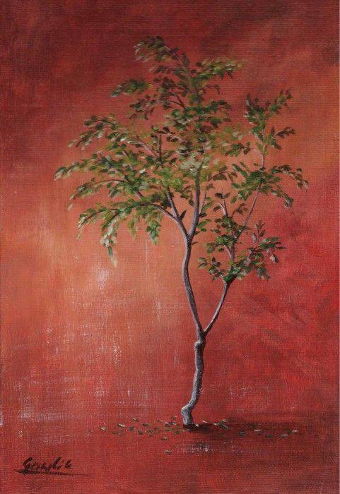 Na obrazie widzimy samotne drzewo, które wyrasta z ziemi ku cieniście czerwonym przestworzom. Tło ma intensywne, ogniste barwy - różne odcienie czerwieni mieszają się jakby ktoś rozmazał je palcami na płótnie, tworząc dynamiczną, lecz spokojną atmosferę. Gałęzie drzewa unoszą się dostojnie, posypane delikatnymi, zielonymi liśćmi, dodając kontrastu i harmonii. Środek kompozycji jest wyważony, a delikatne pociągnięcia pędzla podkreślają subtelną elegancję tego dzieła. A drzewo wygląda jak zaczarowane. Artysta zdaje się używać techniki impasto, co daje teksturze tła żywiołową głębię, a jednak zachowuje finezję w malowaniu drzewa. Styl malarski kieruje myśli ku ekspresji i intuicyjnemu podejściu do twórczości. Łączy w sobie elementy klasyki i nowoczesności, a jego swobodny charakter przyciąga uwagę. Obraz wywołuje w odbiorcy uczucie spokoju, ale i delikatnej niepewności. Może stanowić metaforę życia - samotne drzewo na tle nieprzewidywalnego świata. Hmm, sam jestem drzewem na czerwonym tle, myślę sobie. A reakcje? Mnie to osobiście inspiruje. "Wow, jakie piękne drzewo" - pewnie powiedziałoby dziecko. Może to niemal magiczne "happiness" w samotności natury?