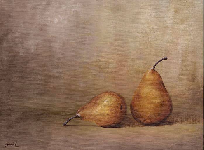 Na obrazie widzimy dwie gruszki ustawione na tle delikatnie rozmytego, beżowego tła. Te gruszki są jak ciepłe złote plamy, kontrastujące z neutralnością otoczenia. Kompozycja obrazu jest prosta, ale jednocześnie pełna elegancji i spokoju. Artysta użył miękkich, płynnych pociągnięć pędzla, co nadaje całości lekką chropowatość, a jednocześnie subtelność. Patrząc na to dzieło, czujemy chwilowy spokój, jakby czas na moment stanął w miejscu. Jest to klasyczny przykład martwej natury, która może budzić nostalgię. Styl obrazu przypomina tradycyjne techniki malarstwa olejnego, gdzie światło jest kluczowym elementem podkreślającym formę i fakturę przedmiotów. Atmosfera obrazu jest przytulna, prawie domowa. Wyobraź sobie ciepłe promienie słońca wpadające przez okno w zimowy poranek. Kiedy na to patrzę, mam ochotę sięgnąć i dotknąć tych gruszek, a one zdają się mówić: "we're here to comfort you." Dziecko powiedziałoby: "Gruszki wyglądają jak złote zabawki!" I rzeczywiście, jest w nich coś magicznego. Obraz wywołuje uczucie tęsknoty za prostotą życia, za chwilami, gdy rzeczy miały niewysłowiony urok. Jest w tym coś osobistego, co sprawia, że każdy może dostrzec w tych gruszkach coś swojego.