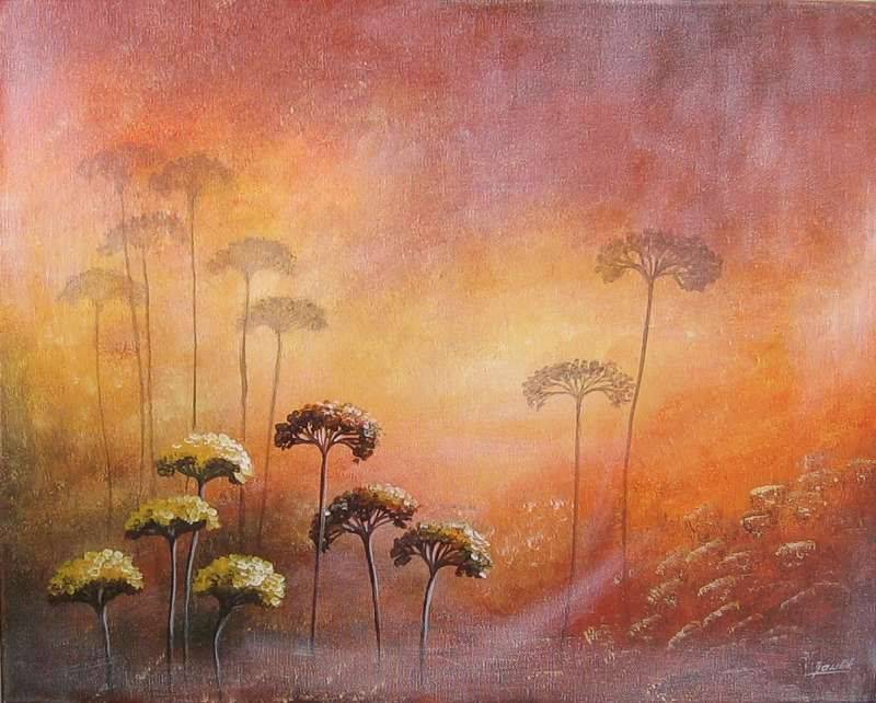 Ten obraz to prawdziwa magia światła i cienia. Dominują na nim ciepłe kolory — od głębokich pomarańczy po subtelne, złociste żółcie, które przenikają się z odcieniami czerwieni. Kompozycja jest przemyślana, z wyraźnie zarysowanymi, smukłymi łodygami roślin, które unoszą się ku niebu, jakby chciały sięgnąć gwiazd. Czyż nie przypomina to nieco porannego spaceru po skąpanej we mgle łące? Atmosfera obrazu jest przytulna, pełna delikatnego spokoju. Emanuje z niego nostalgia za letnimi dniami. Trochę jak sweet dream, w którym chcielibyśmy pozostać na zawsze. Technika, jakiej użył artysta, to subtelne rozmycie i miękkie przejścia kolorów, co nadaje obrazowi eterycznego charakteru. Malarz zastosował delikatne pociągnięcia pędzlem, by uwypuklić teksturę kwiatów. Myślę sobie, że taki obraz na pewno wywołuje emocje. Dziecko mogłoby powiedzieć: "Patrz, to jak bajkowe drzewa!" Dla mnie obraz jest przypomnieniem, by cieszyć się ulotnymi momentami. Czasami przy takiej sztuce po prostu chcesz wziąć głęboki oddech i poczuć tę chwilę, prawda?
