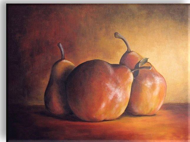 Na obrazie widnieją soczyste gruszki, których ciepłe odcienie brązu, złota i oliwkowej zieleni przenikają się w harmonijnej kompozycji. Owocowe kształty są pełne, zaokrąglone, niczym smakowite kule, które aż chce się dotknąć. Artysta postawił na technikę chiaroscuro, podkreślając kontrast pomiędzy światłem a cieniem. W hołdzie klasycznym martwym naturą, obraz emanuje spokojem i ciszą, jakby czas się zatrzymał. Patrząc na tę scenę, można poczuć ciepło, jakby gruszki były w słońcu. Styl jest realistyczny, lecz zdecydowanie z nutką impresjonizmu – zacierają się kontury, a światło igra z powierzchnią owoców. Chciałoby się powiedzieć: "Yummy!", bo te gruszki wydają się niemal namacalne. Niebo wzięte do słoika. Dzieło kusi swą prostotą, lecz głębia emocji, jakie wywołuje, jest nieocenioną wartością. A można sobie wyobrazić, jak takie gruszki smakują – soczyście, słodko, odrobinę cierpko. Dla 7-latka to po prostu obraz pełen fajnych gruszek. Powstaje wrażenie, że każda linia i cienie są starannie przemyślane, ale i swobodne zarazem. Obraz wzbudza refleksję nad codziennymi momentami, które są piękne w swojej prostocie.