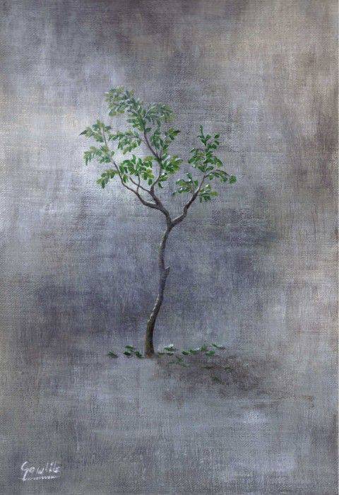 Obraz przedstawia delikatne drzewko stojące samotnie na tle subtelnej, szarej mgiełki. Zieleń liści wyróżnia się na bladym tle, przyciągając wzrok swą świeżością i nadzieją. Kompozycja jest prosta, a jednak niesamowicie wymowna. Drzewko wygląda tak, jakby walczyło o każdy promień słońca. Przestrzeń wokół drzewa jest pusta, co nadaje obrazowi klimat spokoju i refleksji. Artysta zastosował technikę, która przypomina delikatne pociągnięcia pędzla, co dodaje obrazowi lekkości. Styl jest minimalistyczny, co pozwala skupić się na emocjonalnej sile centralnego motywu. Feelings of solitude mogą kołatać w sercu odbiorcy, kiedy patrzy na to samotne drzewko. To trochę smutne, trochę inspirujące. Wystrój kolorystyczny – głębokie tony zieleni i chłodne szarości – tworzy nastrój kontemplacji. Patrząc na ten obraz, można pomyśleć o przetrwaniu i nadziei. Może zatem budzić nostalgię lub dawać chwilę ukojenia. "To drzewko jest jak moje", pomyślało małe dziecko. Dla mnie ten obraz jest jak cichy szept w środku hałaśliwego dnia, prowadzi do refleksji nad chwilowością życia.