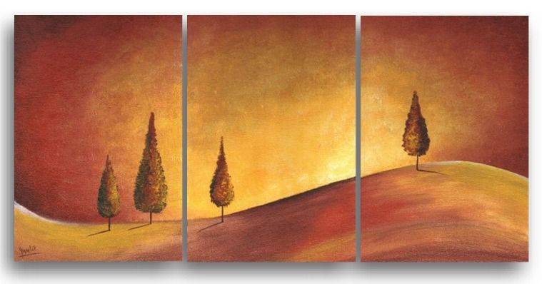 Na obrazie widzimy pejzaż, który zapiera dech w piersiach swoją prostotą i harmonią. Dominują ciepłe odcienie czerwieni, pomarańczu i żółci, które tworzą atmosferę spokoju i nostalgii. Kompozycja składa się z trzech paneli, co dodaje dziełu nowoczesnego i minimalistycznego charakteru. Delikatne przejścia kolorów sugerują zmieniające się pory dnia, jakby całość wibrowała ciepłym blaskiem zachodzącego słońca. Drzewa stojące na wzgórzach (na pierwszym planie trzy, a na trzecim jedno) wywołują wrażenie harmonii i równowagi. Ich strzeliste, smukłe sylwetki przypominają wieże czy iglice. Artysta zastosował technikę impastu, co dodaje tekstury, a ślady pędzla są subtelnie widoczne, dając obrazowi dynamikę. To wszystko sprawia, że obraz niemal "śpiewa". Patrząc na to dzieło, można poczuć się jak na łonie natury, z dala od miejskiego zgiełku. Feel the serenity? Ja tak. Każdy widz może odnaleźć tu coś dla siebie — dzieci mogą widzieć przygodę, a dorośli ucieczkę. To dzieło przypomina mi o wakacjach, kiedy siedziałem na plaży i marzyłem o niekończących się przygodach. Kolory i dynamika wprowadzają w świat marzeń, gdzie czas płynie inaczej. Można się zanurzyć w tym obrazie tak samo, jak zanurza się w idealnie ciepłym morzu podczas wakacji.