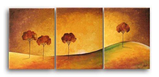Na obrazie widzimy trzy panele, każdy pokazujący część tej samej sielankowej scenerii. Dominują ciepłe odcienie pomarańczu i brązu, które przypominają złocistą jesień. Drzewa z czerwonymi koronami stoją na delikatnie pofalowanych wzgórzach, tworząc harmonijną kompozycję. Całość emanuje spokojem i melancholią, jakby czas zatrzymał się na chwilę. Artysta zastosował techniki impresjonistyczne, co widać w miękkich przejściach między kolorami i nieco zamglonym tle. Obraz może wywołać uczucie nostalgii, wspomnienia o ciepłych, jesiennych spacerach. Jest w nim coś magicznego, co sprawia, że chcemy się w nim zanurzyć. Kompozycja sprawia wrażenie lekkości i swobody. Zastanawiam się, co te drzewa myślą, stojąc tak samotnie. Dla dziecka, to miejsce, gdzie mieszkają elfy. A dla innych? Może pole do snucia marzeń. Obraz zachęca do przemyśleń, co kryje się za horyzontem. To serene simplicity sprawia, że czujemy wewnętrzny spokój. Mimo prostoty, skłania do refleksji nad przemijaniem czasu i pięknem natury.