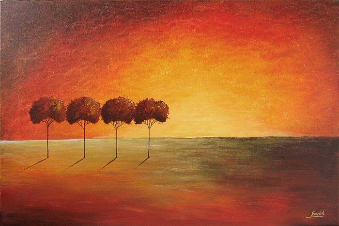 Na obrazie widzimy pięć drzew, które stoją w równej linii na tle płonącego nieba. Dominują ciepłe barwy, przede wszystkim odcienie czerwieni, pomarańczu i żółci, które nadają całej kompozycji ton zachodzącego słońca. Drzewa, choć proste, mają w sobie coś magicznego, jakby stały na straży tej niezwykłej chwili. Ich cienie wydłużają się, tańcząc na ziemi, dodając dynamiki całemu przedstawieniu. Atmosfera obrazu jest pełna spokoju, takiego wieczornego wyciszenia, lecz jednocześnie emanuje energią - jakby cały świat właśnie chwytał ostatnie chwile dnia. Styl artysty jest minimalistyczny, co podkreśla użycie przestrzeni i barw. Użycie techniki gradacji kolorów sprawia, że niebo i ziemia stapiają się w jedną całość - almost like a dream. Emocje? Obraz wzbudza poczucie nostalgii i refleksji. Można się zatracić w tym widoku, rozmyślając o minionych dniach i przyszłych wyzwaniach. Jakbyś chciał zawołać: "Poczekaj, jeszcze chwila!". A dziecko by powiedziało: "Te drzewa to stoją takie smukłe i śmieszne". W delikatnym błędzie kompozycji tkwi jakaś prawda o pięknie codziennych chwil, co sprawia, że dzieło zostaje z nami na długo. Naprawdę czarujący widok.