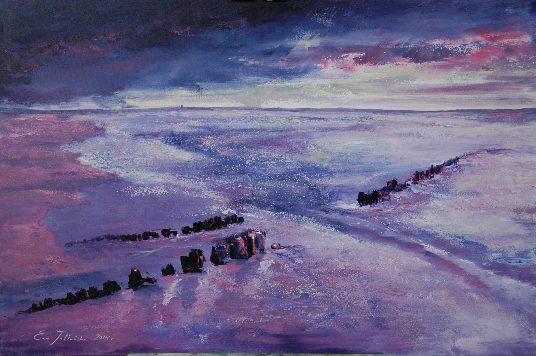 Na obrazie widzimy przestrzeń pełną intensywnych odcieni fioletu i różu, które niczym delikatne fale rozlewają się po całej płaszczyźnie. W oddali horyzont z lekka rozmazany w niebieskoszarych barwach, a ciemne chmury zdają się zwiastować burzę. W centrum kompozycji widać ciemne, nierówne kształty przypominające stare pomosty czy drewniane pale, które prowadzą wzrok ku horyzontowi. Obraz emanuje spokojem, ale jednocześnie czymś tajemniczym i niepokojącym. To artystyczne połączenie stwarza dreamy atmosferę, jakbyśmy znajdowali się w śnie. Artysta stosuje technikę impastu, nadając teksturę falom i chmurom, co dodaje głębi i trójwymiarowości. Uczucie melancholii i zadumy ogarnia odbiorcę, zmuszając do chwili refleksji nad przemijaniem czasu i pięknem natury. Widok niesie spokój, ale i fascynację nieznanym. Fascinating, prawda? "Ten obraz jest jak wieczorny sen" - mógłby powiedzieć mały artysta. Zagubiony krajobraz wprowadza widza w stan medytacji i przemyśleń. To dzieło malarskie zachwyca i inspiruje, pozostawiając trwałe wrażenie.