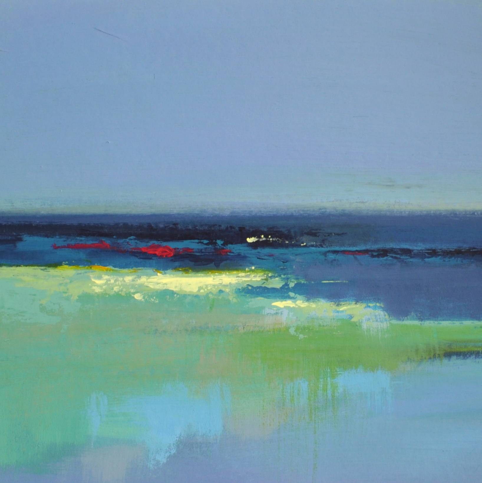 Obraz emanuje spokojem, który od razu wciąga w swój tajemniczy świat. Dominują jasne, pastelowe kolory: błękit i zieleń, przeplatane dynamicznymi akcentami czerwieni. Kiedy patrzę na ten obraz, czuję się jak nad morzem o poranku, gdzie słońce dopiero próbuje przebić się przez mgłę. Chłodne odcienie niebieskiego kontrastują z żywymi przebłyskami czerwieni, jakby ktoś zostawiał tam swoje "footprints" na skraju snu i jawy. Technika jest abstrakcyjna, z delikatnymi pociągnięciami pędzla. Artysta oddaje harmonię natury w sposób nieoczywisty, ale jakże przekonujący. Obraz pobudza wyobraźnię i uspokaja jednocześnie, co jest dość niezwykłe. Myślę sobie, że każdy dzień jest nową przygodą, jak patrzy się na to dzieło. Można poczuć lekki powiew wiatru, mimo że nie ma tu ani jednej sylwetki człowieka czy drzewa. Mam wrażenie, że to płynność barw i forma sprawiają, że czujemy emocje natury. Jest w tym coś magicznego, co sprawia, że chce się tam zostać na dłużej, wpatrując się w głębię kolorów i ukrytych znaczeń. Super obraz i tyle!