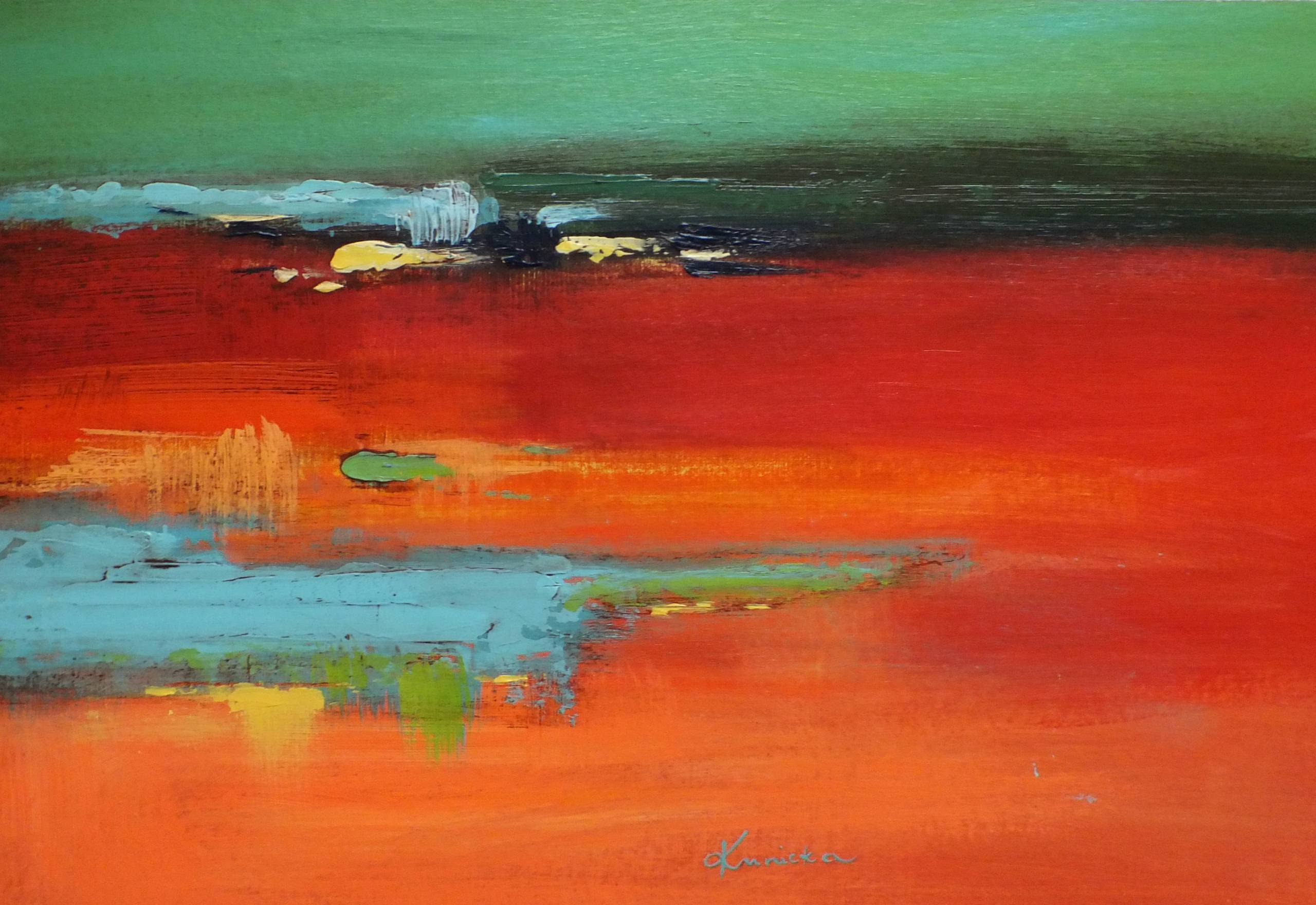 Na obrazie dominuje intensywna gama kolorów, które zdają się przenikać przez siebie jak w ruchu tanecznym. Głębokie czerwienie i pomarańcze płoną jak ogień, kontrastując z chłodnym, zdecydowanym błękitem oraz zielenią. Kiedy patrzę na to dzieło, odnoszę wrażenie, jakbym znalazł się na granicy dwóch światów. Kompozycja jest abstrakcyjna, ale harmonijna. Wykorzystane techniki przypominają pociągnięcia pędzlem, które zdają się być spontaniczne, a jednocześnie przemyślane. Wow! Obraz tętni energią, którą można poczuć niemal fizycznie. To jakby artysta bawił się kolorami, jak dziecko z klockami. Każda z plam może symbolizować inne emocje: pasję, spokój, radość. Czuć tu pewną dynamikę, ale i harmonię. W kontekście sztuki współczesnej to jak 'fireworks' emocji, która eksploduje na płótnie. Całość pozostawia przestrzeń do osobistych interpretacji, a także skłania do refleksji.
