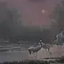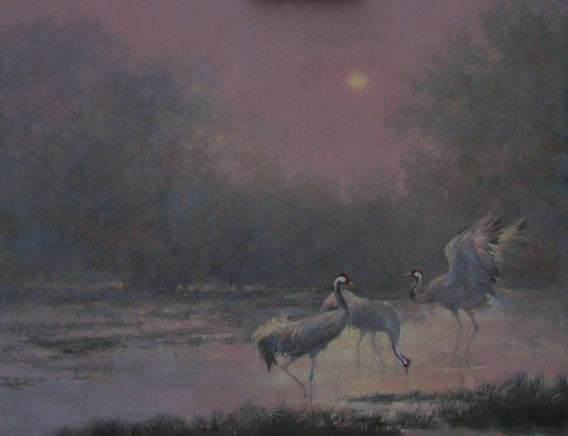Obraz przedstawia malownicze wybrzeże o brzasku, z trzema majestatycznymi ptakami brodzącymi w płytkiej wodzie. Dominują tu pastelowe róże i głębokie szarości, które nadają scenie tajemniczej, nieco melancholijnej atmosfery. Kompozycja skupia się na eleganckich sylwetkach żurawi, delikatnych jak rysunek ołówkiem. Artysta użył subtelnych pociągnięć pędzla, tworząc efekt mglistych linii, dzięki czemu obraz wydaje się wręcz eteryczny. Ruch jednego z ptaków, wznoszącego skrzydła, dodaje dynamiki, jakby chciał uciec do krainy marzeń. Oh boy, to jest jak sen! Patrząc na ten obraz, można poczuć się, jakby się było częścią tej cichej sceny. Ten mistyczny nastrój zachęca do refleksji, może nawet skłania do wyciszenia. Czujemy echo czegoś odległego, a może po prostu spokój natury. W odbiorcy to dzieło może wywoływać uczucia nostalgii za prostotą i harmonią. Ten obraz mówi "escape" od codziennego zgiełku i miejskiego hałasu. Czyż nie jest to urocze? Jakby czas stanął w miejscu, pozwalając widzowi na chwilowy oddech w innym wymiarze.