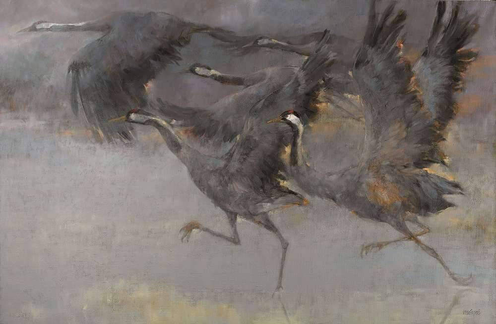 Na obrazie widzimy piękną kompozycję dynamicznie rozpostartych skrzydeł żurawi, uwiecznionych w momencie, gdy startują do lotu. Dominują stonowane barwy: szarości, brązy i delikatne akcenty pomarańczowe, które dodają obrazowi ciepła i głębi. Postacie ptaków, choć wyraziste, są nieco zamglone, co wprowadza atmosferę tajemnicy i ulotności chwili. Obraz oddaje ruch i energię, jakby zatrzymane w kadrze. Styl malarski, z delikatnym pociągnięciem pędzla i impresjonistyczną nutą, pozwala poczuć wiatr pod skrzydłami żurawi. Wow, te ptaki naprawdę fruwają szybko! Emocje, które wywołuje to dzieło, to przede wszystkim zachwyt nad naturą i jej pięknem. Odbiorca może poczuć nostalgię, przypominając sobie letnie poranki spędzone na łące. Obraz jest po prostu breathtaking. Każdy z nas może interpretować tę scenę na swój sposób, odnajdując w niej spokój, radość lub tęsknotę. To prawdziwie inspirujące dzieło, które porusza do głębi.