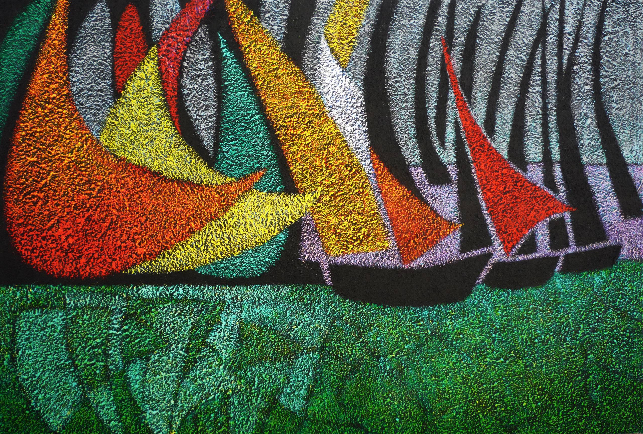 Obraz jest jak wybuch kolorów. Mocne czerwienie, żółcie i zielenie układają się w abstrakcyjne kształty, które przypominają żagle statków pływających po wzburzonym morzu. Tło stanowi ciemny kontrast, przez co jasne barwy wydają się pulsować, jakby były w ruchu. Jest tu taki chaos, ale jednocześnie wszystko pasuje. Kompozycja przyciąga wzrok, zachęcając do odkrywania każdej części po kolei. Styl artysty jest dynamiczny. Praca z fakturą dodaje obrazowi głębi, a użycie grubych warstw farby (jakby impasto) zwiększa intensywność całego dzieła. To tworzy wrażenie energii i ekspresji, trochę jak jazda na rollercoasterze. Czuję, że artysta bawił się tym stylem, może nawet był trochę rebel w podejściu do tradycyjnych form. Dziecko może powiedzieć: Łódki płyną szybko! Obraz jest radosny, ale pełen niepokoju. Może symbolizować podróż, poszukiwanie lub po prostu wolność. Ta interpretacja zależy od widza. Every detail matters tutaj, a jednocześnie ramy są otwarte na osobiste refleksje. Zachwyca i trochę zmusza do myślenia.