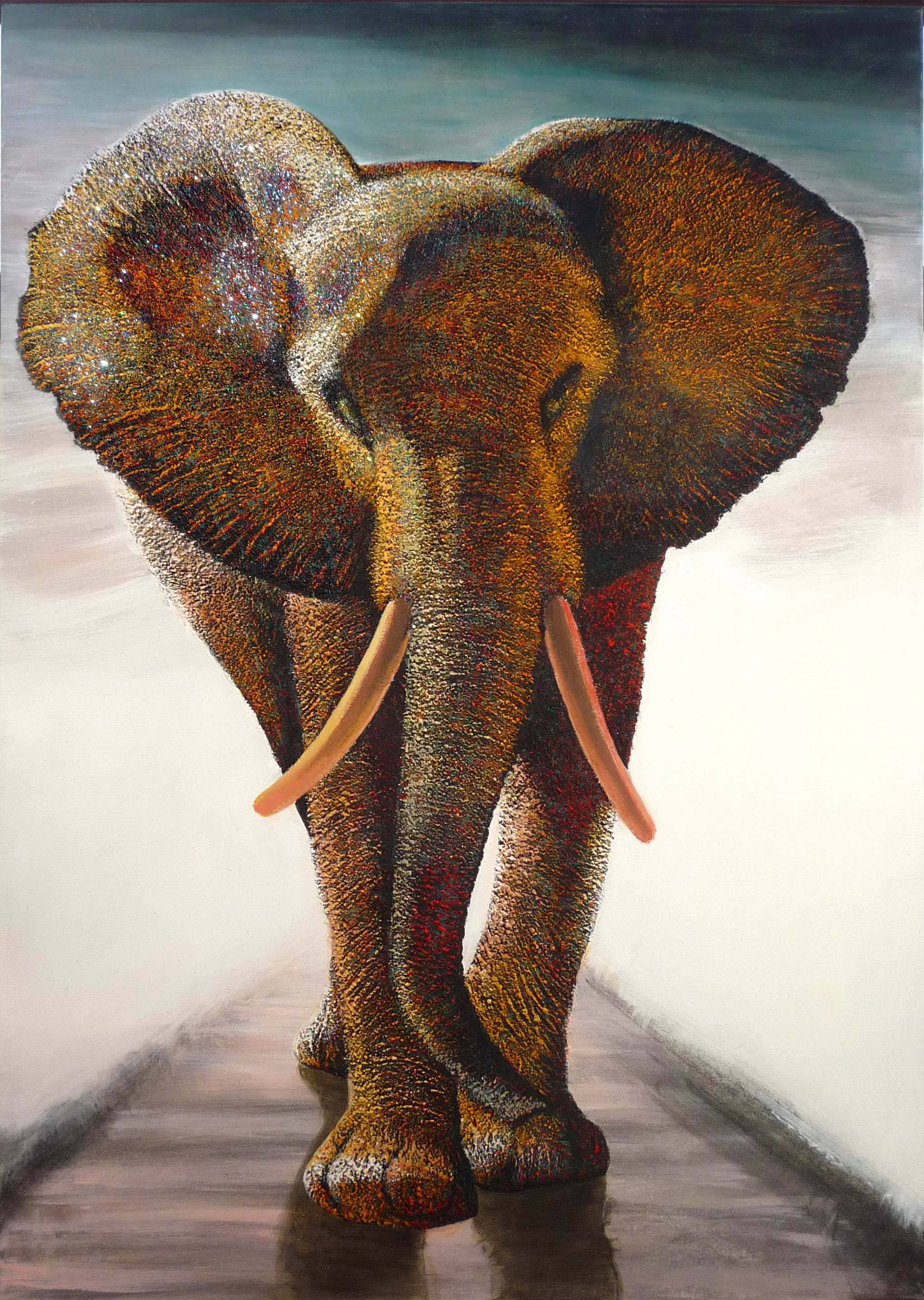 Na obrazie widzimy majestatycznego słonia kroczącego po nieokreślonej, mglisto-białej przestrzeni. Jego ogromne uszy, pełne detali i ciepłych odcieni brązu, dominują kompozycję, przyciągając wzrok. Nosyku słoń skomponowany jest z dziesiątek, jeśli nie setek małych kropek, które nadają mu niecodziennej, niemalże magicznej faktury. Mówi się, że ma coś w sobie, co przywołuje uczucie wewnętrznego spokoju i siły. Kontrast pomiędzy realistycznym detalem a nieokreślonym, rozmytym tłem nadaje całemu dziełu tajemniczego nastroju. Styl artysty to mieszanka realizmu z surrealizmem, dzięki czemu efekt finalny jest jednocześnie konkretny i dreamlike. Można poczuć się, jakby słoń wychodził na spotkanie z odbiorcą z innego, zaczarowanego świata. Słoń wygląda jakby chciał powiedzieć: "Hej, jestem tu, nie bój się mnie". My, jako widzowie, czujemy się niemalże zachęceni, by podejść bliżej, dotknąć jego tekstury, dać się pochłonąć tej niesamowitej aurze spokoju. Wrażenie jest takie, że to sztuka mówi do serca, ponad słowami. I mam nadzieję, że kiedyś zobaczę prawdziwego słonia! Myślę, że obraz ten przypomina nam też o wielkości i pięknie natury, którą często niedoceniamy. Jest w tym coś deeply touching.