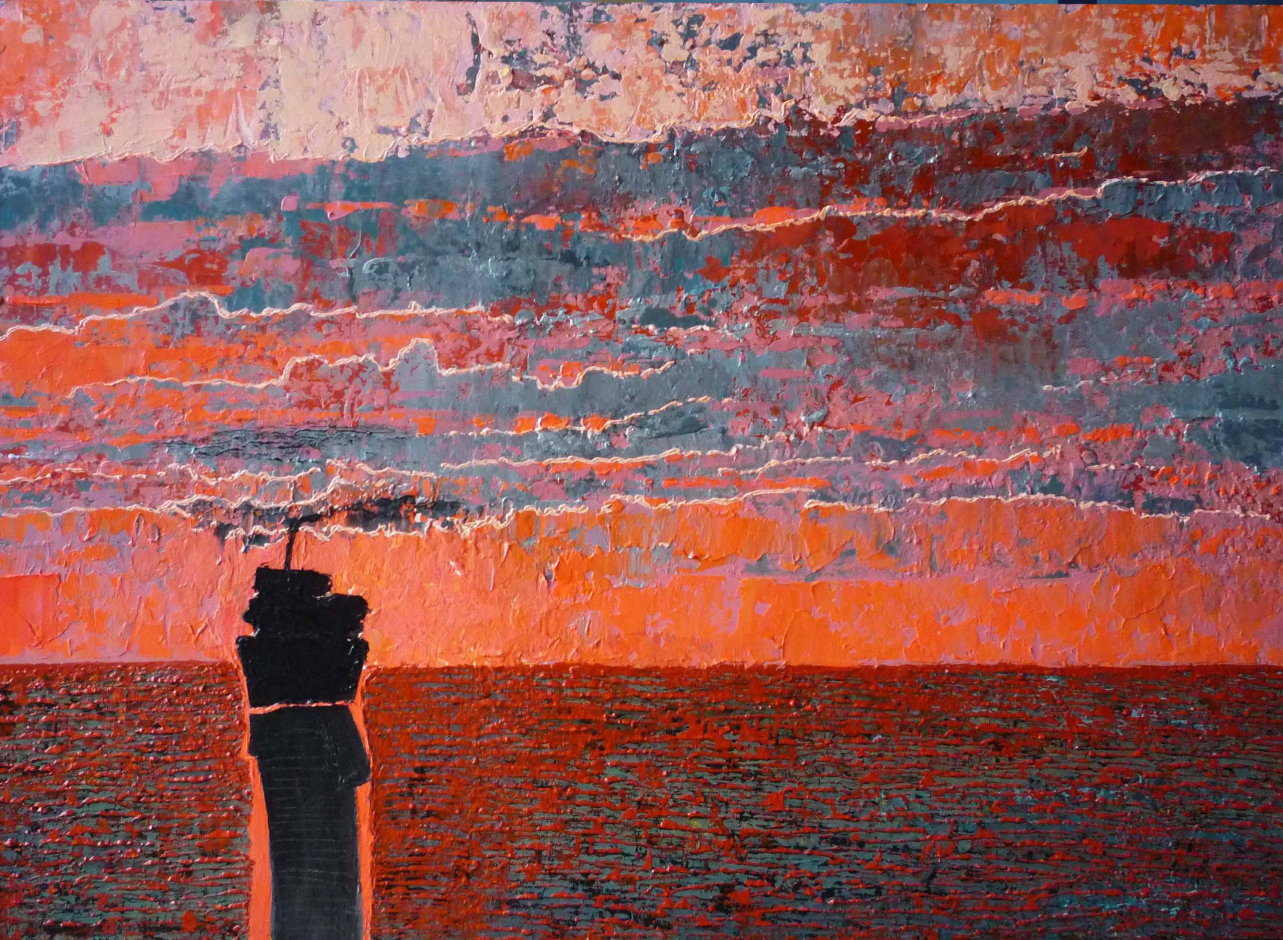Na obrazie dominują intensywne ciepłe kolory: ogniste czerwienie i pomarańcze mieszają się z niebieskimi i szarymi odcieniami, tworząc dynamiczną, niemal pulsującą kompozycję. Faktura jest grubo nakładana za pomocą impasto, co dodaje głębi i trójwymiarowości. W centrum możemy dostrzec sylwetkę statku na tle rozległego morza i nieba, przywodzącą na myśl samotność żeglarza na rozkołysanym oceanie. Atmosfera obrazu jest pełna nostalgii i tajemnicy, przywodząc na myśl "freedom" i nieograniczoność przestrzeni. Artysta wykorzystał technikę kontrastu, aby podkreślić różnice między niebem a morzem, budując dramatyzm sceny. Obraz wydaje się niemal tętnić życiem, hipnotyzując obserwatora, który może poczuć zarówno spokój, jak i napięcie. Kolory wirują w oczach niczym kalejdoskop emocji. Dla mnie to trochę jak patrzenie na zapadający zmierzch z pokładu. Kiedy patrzę na ten obraz, czuję zapach soli i dźwięk fal. Wow! Żywy, poruszający. To dzieło zachęca do zatrzymania się na chwilę, zanurzenia się w myślach, może nawet marzeń o przygodzie. Ciekawość miesza się z fascynacją. Obraz, poza efektowną formą, prowokuje do refleksji nad naszą relacją z bezkresnym horyzontem.