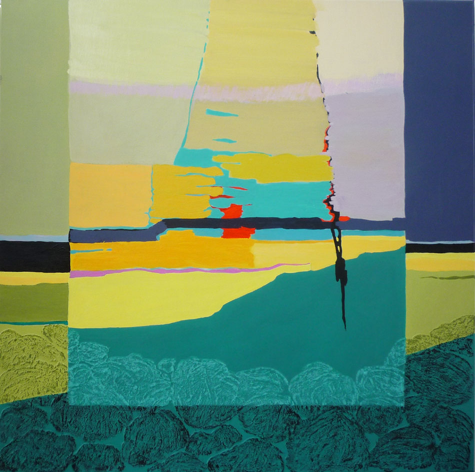 Na płótnie rozlane są płaskie plamy turkusu, żółci i oliwki, przecięte czernią i iskrą czerwieni. Kompozycja półgeometryczna, krawedzie drżą, a w środku wznosi się smuga jak cień masztu. Brzegi mają chropawą fakturę, przypominają kamienie, środek zostaje gładki. Atmosfera zmierzchu, ciepło miesza się z chłodem i trochę mnie to kołysze. Jest spokojnie, ale jakby coś trzeszczało pod skórą. Styl to abstrakcja liryczna, warstwa na warstwie, miejscami impast, chwilami gładko jak ekran bold. Widzę statek na wodzie i słońce, i jest kolorowo. Widz może poczuć tęsknote i nadzieję, a ja czuję, że ta pionowa rysa tnie oko i uspokaja naraz.