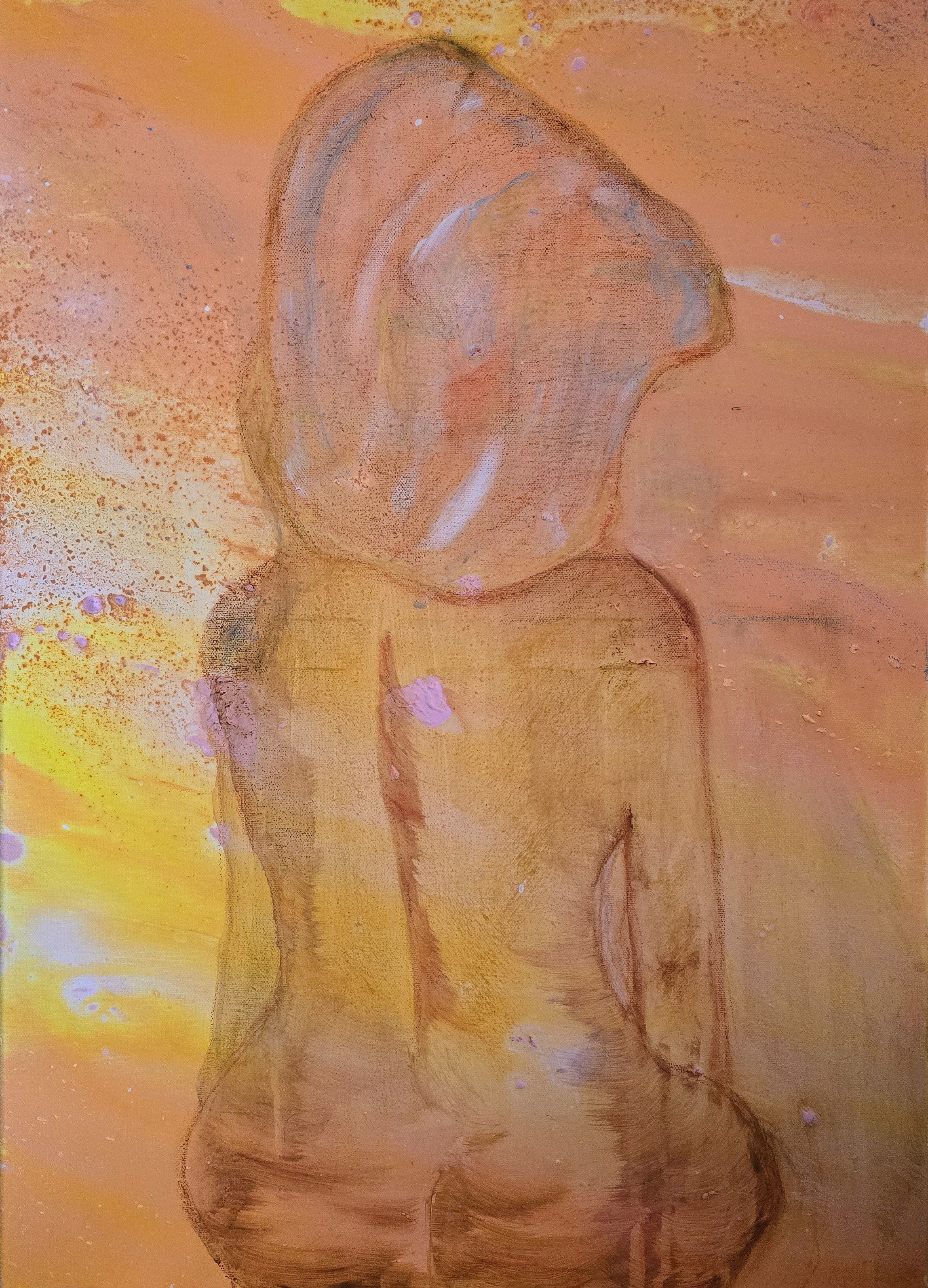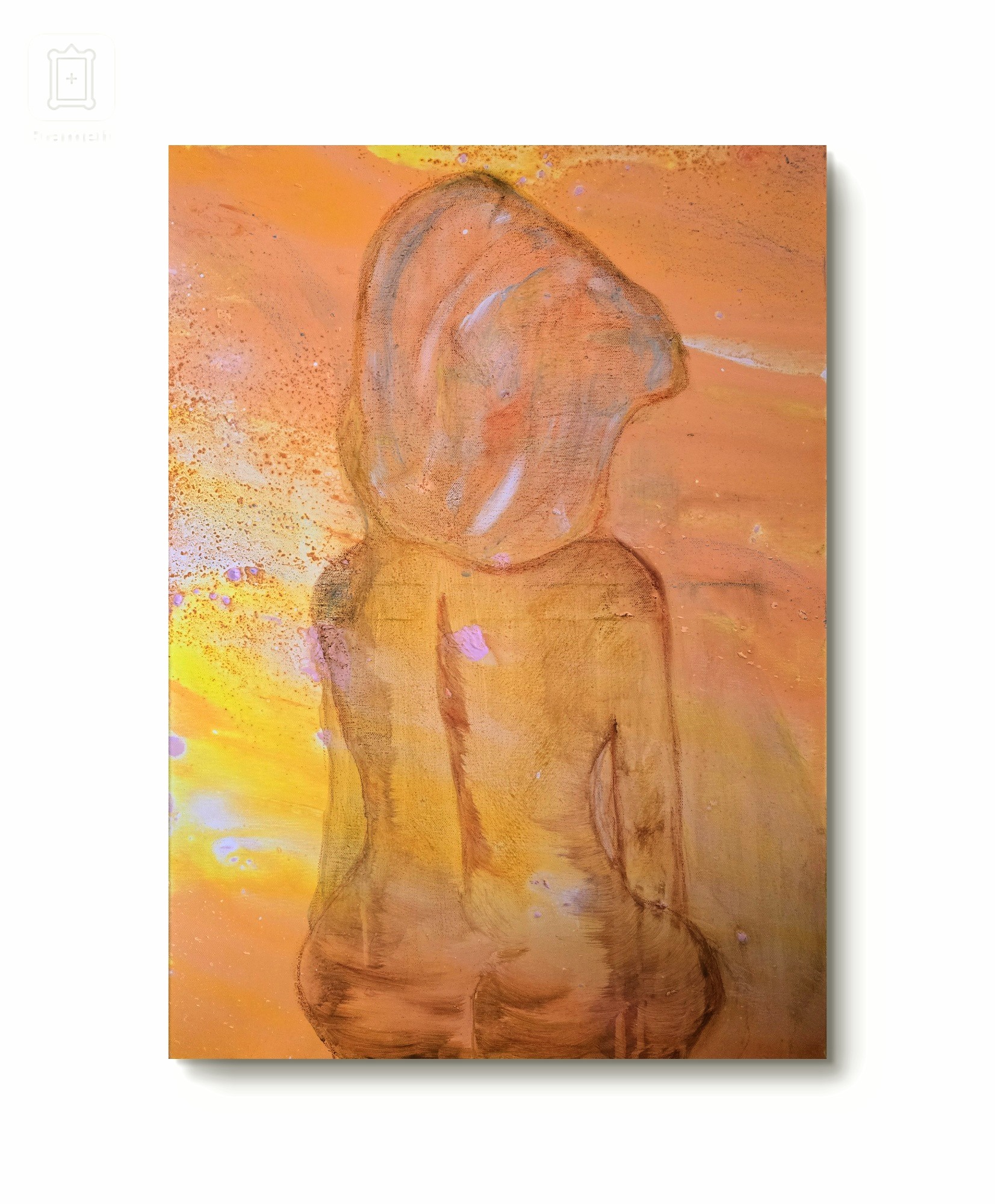 Obraz emanuje ciepłem i delikatnością. Dominuje tu pomarańczowy, przytulny kolor, który sprawia, że czujemy się jakbyśmy oglądali leniwe zachodzące słońce. Postać na obrazie jest subtelnie zarysowana, jej kształty są miękkie i lekko rozmyte, co dodaje tajemniczości. Technika, którą posłużył się artysta, jest niemal impresjonistyczna. Plamy kolorów i delikatne pociągnięcia pędzlem tworzą efekt lekkości i ulotności. To almost feels like a dream. Odbiorca może poczuć spokój, introspekcję, a może nawet delikatny smutek lub tęsknotę. Patrząc na to dzieło, wyjątko czujemy, że artysta chciał uchwycić chwilę samotności, moment, w którym jesteśmy tylko my i nasze myśli. Moja mała siostra powiedziała: "To wygląda jak chmurka z bajki!". Sam obraz zachęca do refleksji nad tym, co jest niewidoczne dla oczu i co dzieje się wewnątrz nas samych. Jest w tym coś magicznego i nieuchwytnego. Widz może zastanowić się nad swoją samotnością i nad tym, jakie kolory ma jego własne wnętrze.