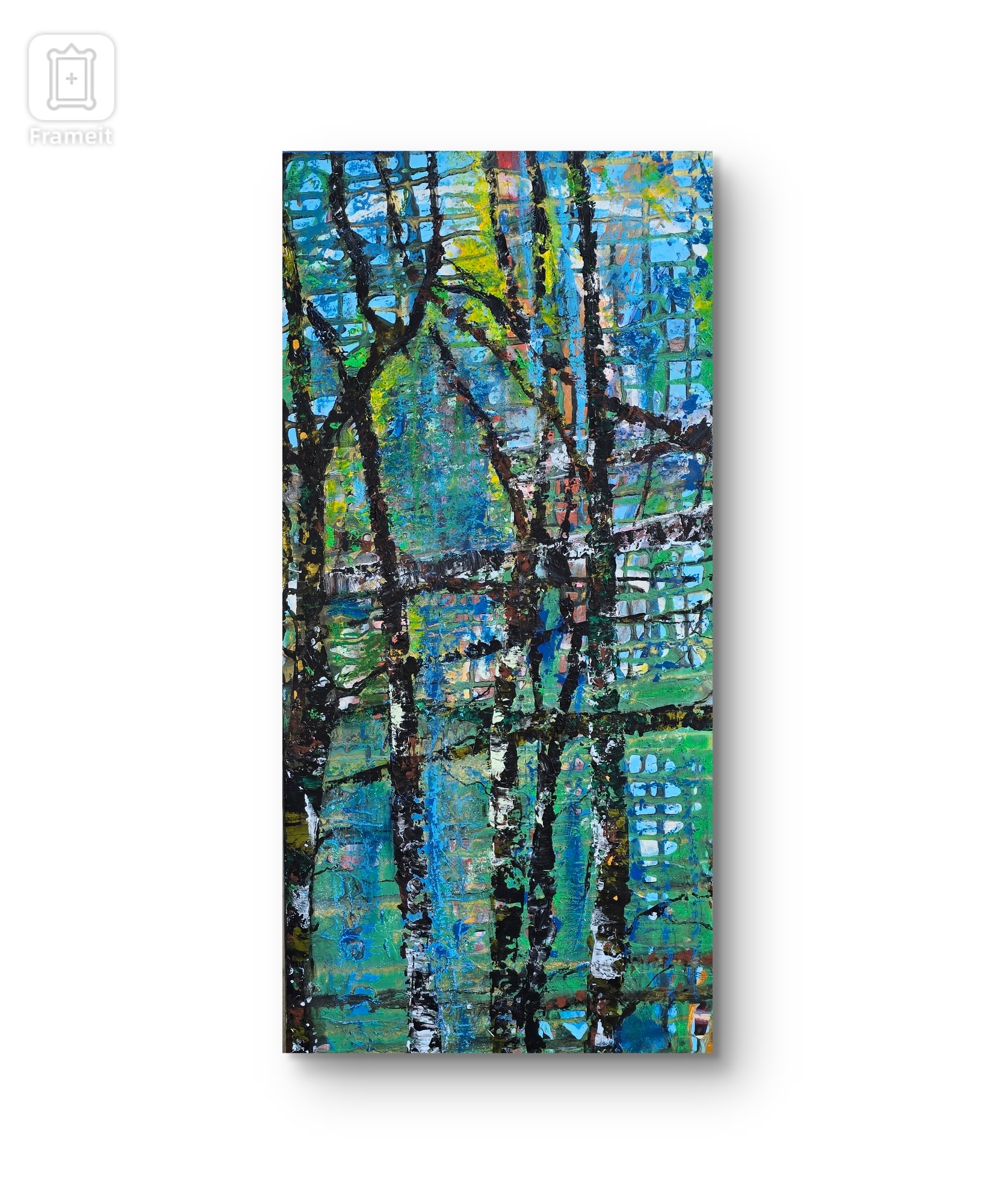 Obraz jest kolorowym karnawałem kolorów i kształtów. Dominują tu odcienie niebieskiego, zieleni i żółci, tworząc bogatą i żywą paletę, która przypomina spacer po lesie w słoneczny dzień. Smukłe, czarne kontury drzew przenikają przez płótno, dodając kontrastu i rytmu do kompozycji. Zastosowanie impastu sprawia, że tekstura obrazu jest wyraźnie wyczuwalna, a nałożenie farby w grubych warstwach nadaje mu dynamikę i głębię. Atmosfera obrazu jest jednocześnie spokojna i pełna energii. Czujesz się jak w magicznym lesie, gdzie wszystko jest możliwe, a czas płynie wolniej. Maluje się tu subtelna granica między rzeczywistością a snem, która kusi, by sięgnąć po coś więcej. Styl artysty to świetne połączenie abstrakcji i impresjonizmu, oddające esencje natury w sposób nowoczesny. Możesz niemal usłyszeć szelest liści i ciepły powiew wiatru. Obraz wywołuje gamę emocji, od zachwytu po zadumę. Jedno spojrzenie i już czujesz, jak serce bije troszkę szybciej. To jak promenada w wyobraźni, gdzie każde drzewo opowiada swoją historię. "Wow, ale dużo niebieskiego!" powiedziałby pewnie mały chłopiec z błyskiem w oczach. A ja, cóż, widzę tu coś takiego jak "freedom". Tak, to miejsce, gdzie można się zgubić i odnaleźć zarazem.