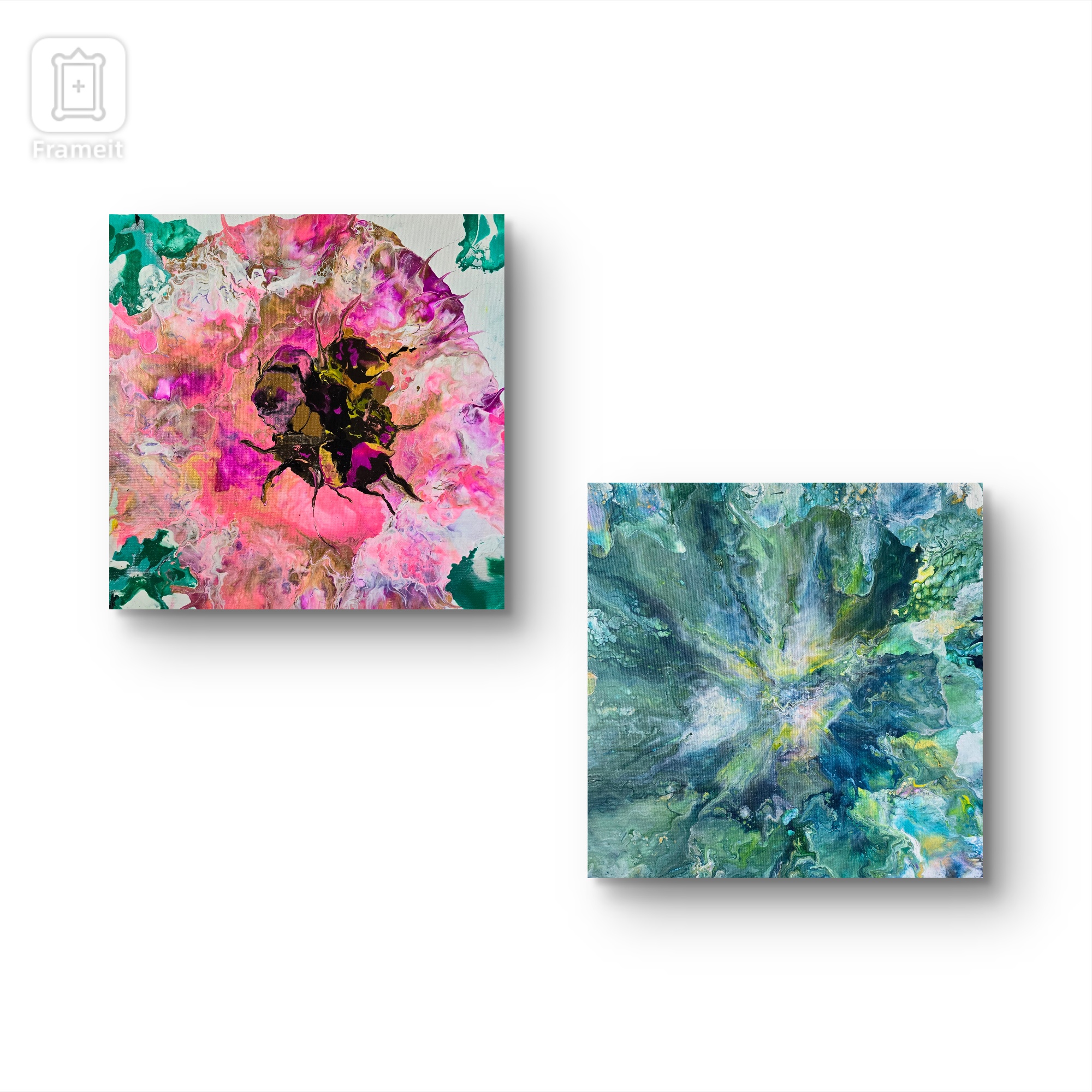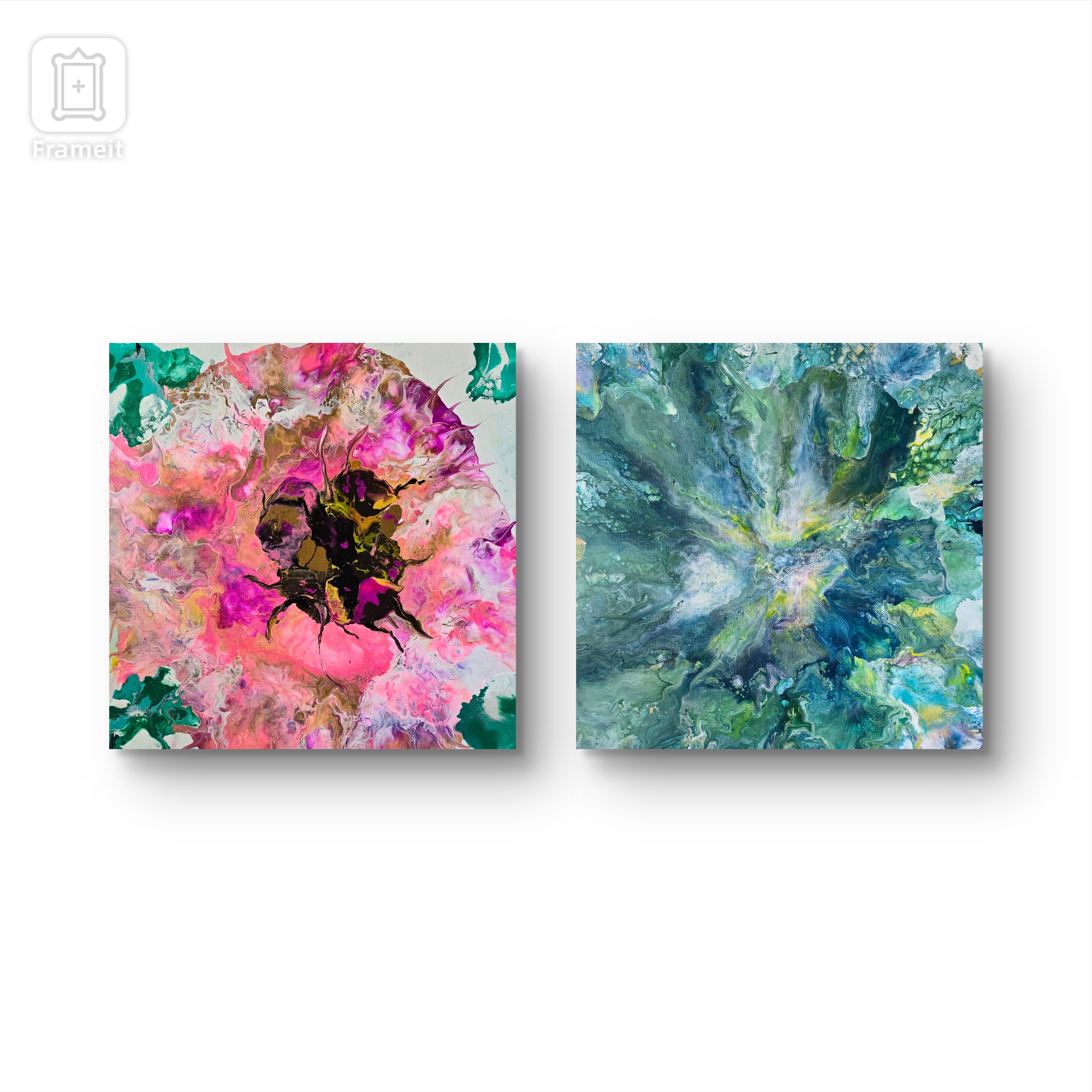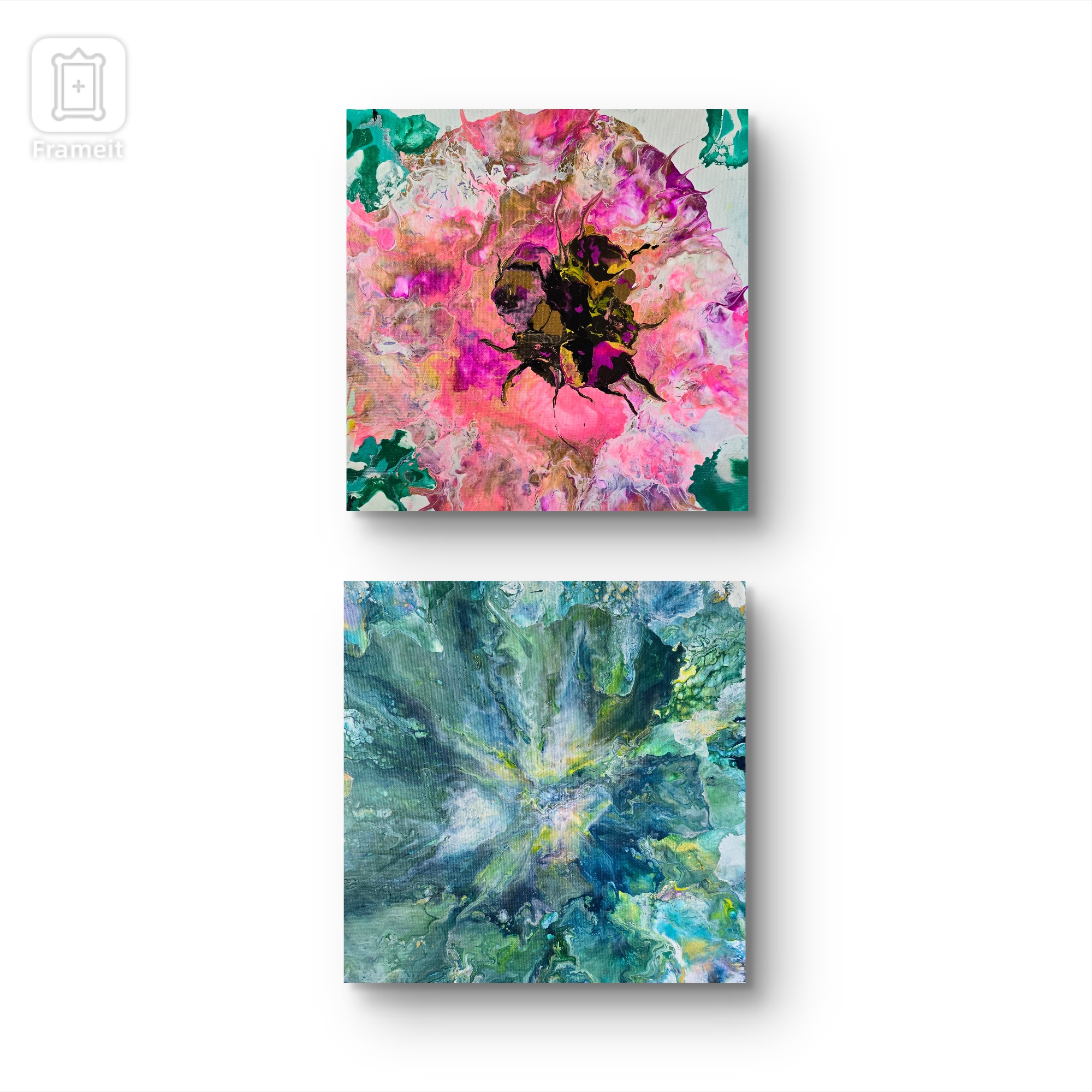 Obraz składa się z dwóch kwadratowych części, które jakby walczyły o uwagę widza. Po lewej stronie widzimy eksplozję różu i fioletu, które tańcują wokół ciemniejszego, niemal czarnego środka. Krańce płótna wzbogacone są akcentami zieleni, jakby malarz chciał przypomnieć o przyrodzie. Po prawej dominuje chłodny niebieski i zieleń, a całość wydaje się przedstawiać wir wodny. Może to oceaniczne głębiny? Oba elementy obrazów kontrastują ze sobą - jeden pełen energii, drugi spokojny i refleksyjny. Artysta z pewnością eksperymentował z techniką pouringu, tworząc organiczne, niemal płynne kształty. To takie "wow" dla oka! Atmosfera dzieł jest dynamiczna, pełna emocji. Można by rzec, że jedna część płótna krzyczy, a druga śpiewa kołysankę naturze. Obrazy mogą wywoływać różnorodne emocje. Część różowa przywodzi na myśl kwiaty w pełnym rozkwicie, symbol żywiołowości i radości. Druga część zaś koi, uspokaja jak zimne morze w spokojny dzień. Kto wie, może artysta chciał przedstawić wewnętrzną walkę między emocjami? Dla mnie te obrazy są jak dwie opowieści, które mają swoje unikalne piękno i głębię.