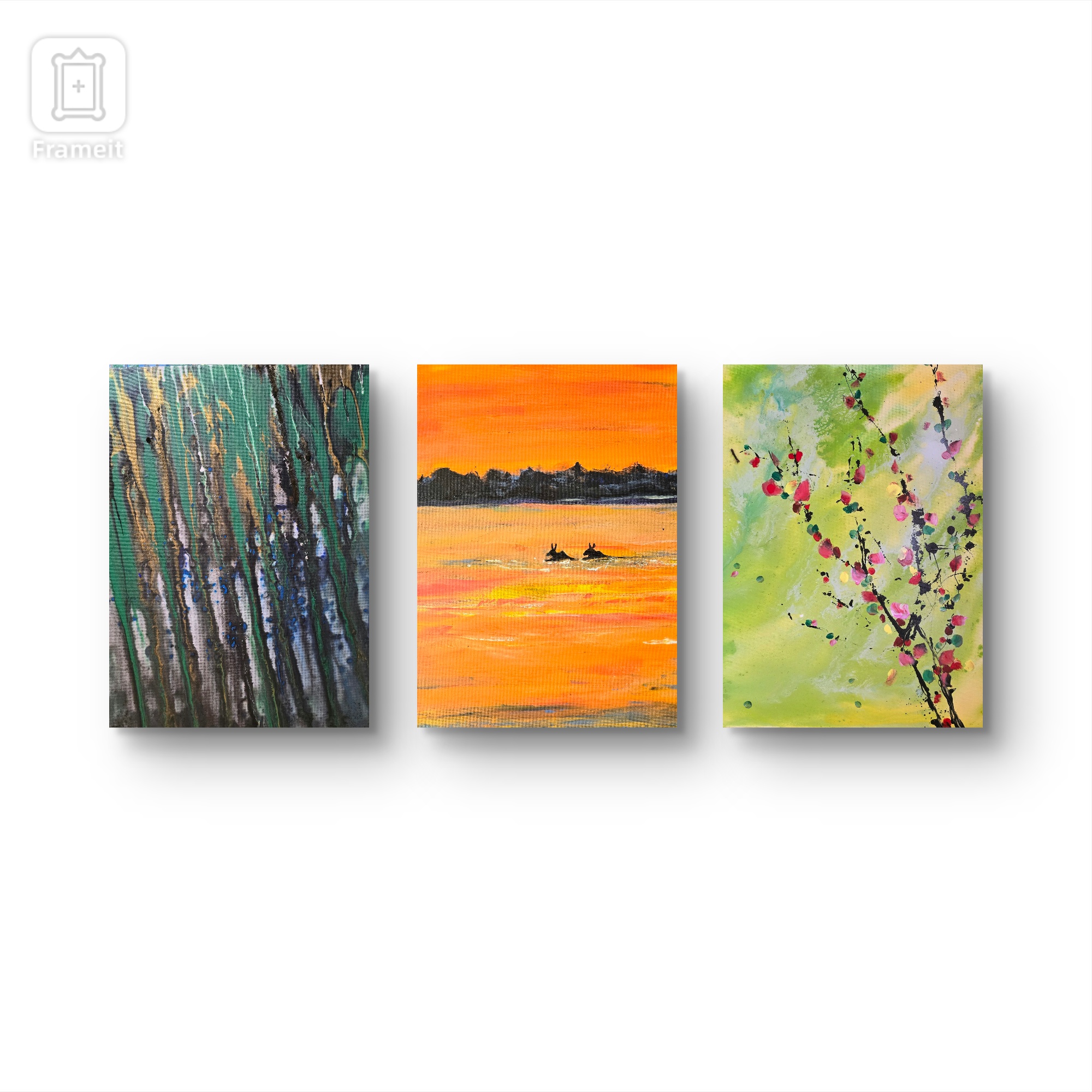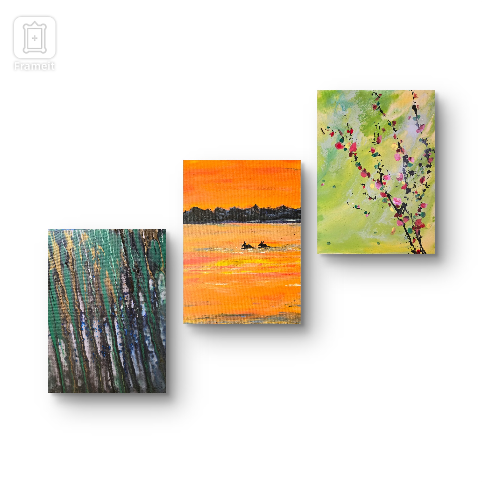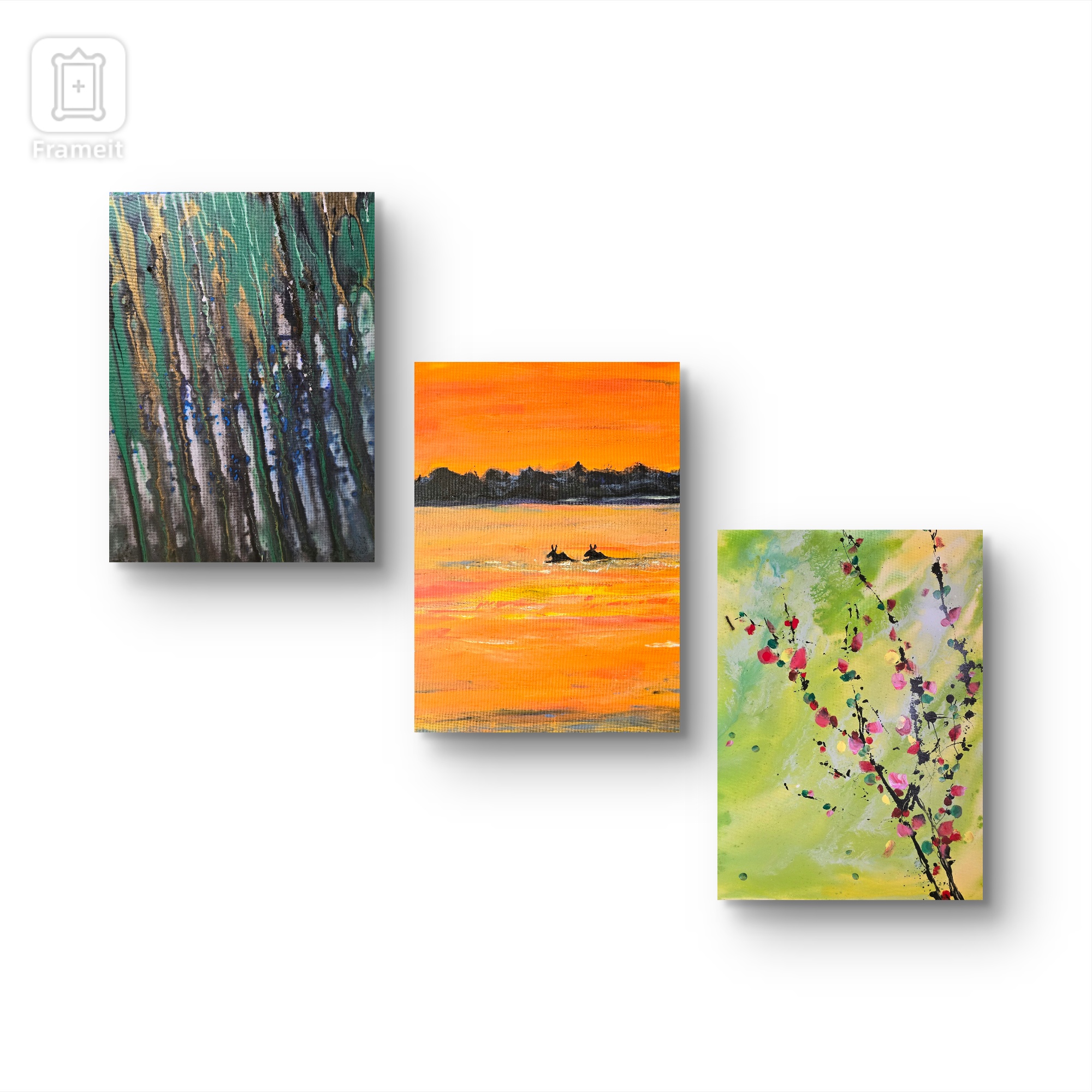 Na obrazie mamy trzy różne prace, każda z nich jest jak osobne opowiadanie, a razem tworzą niepowtarzalną kompozycję. Pierwsza z lewej strony to abstrakcyjna wizja przypominająca korę drzewa, z nutą zieleni i brązu przelatującą wzdłuż płótna, jak las, który widziany jest z bliska. Środkowy obraz emanuje ciepłem zachodzącego słońca, rozlewającym się pomarańczowo po powierzchni wody. Dwie sylwetki na kajakach dodają dynamiki, jakby chwila ta była zatrzymanym westchnieniem przed zmierzchem. Trzeci obrazek to eksplozja wiosennych kwiatów na gałązce, unosząca się na tle soczystej zieleni, jakby natura wreszcie się przebudziła po zimowym śnie. Dzięki wykorzystaniu akryli, artysta osiągnął bogactwo faktur, które przyciągają wzrok i wręcz proszą o dotknięcie. Jasne i żywe kolory dodają energii, a cała kompozycja jest pełna optymizmu i nadziei, jakiejś tęsknoty za dniem pełnym sunshine. Obrazy mogą wywoływać różne emocje: od nostalgii po szczere zdumienie. Patrząc na nie, czułem przypływ radości, coś jak małe szczęście spotkane przypadkiem w codziennym biegu. Fajnie byłoby mieć taki w domu!
