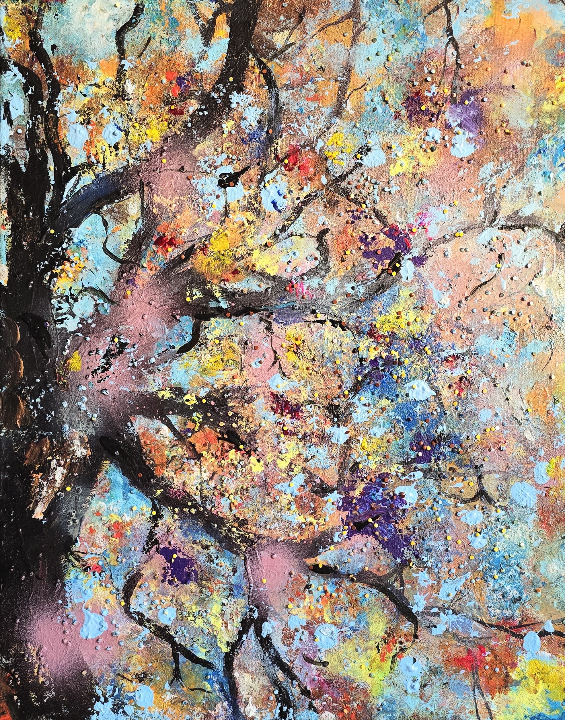 Obraz prezentuje dwie części, które uzupełniają się niczym harmonia barw. Na górze mamy bukiet kwiatów, eksplozję kolorów: soczyste pomarańcze, żółcie i fiolety na tle przygaszonego różu. Wyraziste pociągnięcia pędzla nadają całości energii i organicznej tekstury. A poniżej... spokój lasu odbijającego się w tafli wody. Zielenie i brązy mieszają się ze sobą, tworząc wrażenie głębi. Atmosfera jest dreamlike, jakbyśmy zaglądali do innego świata, gdzie wszystko jest możliwe. Styl artystyczny łączy impresjonistyczną ekspresję z momentami abstrakcji. Kwiaty wydają się niemal tańczyć w wazonie, a drzewa - mam wrażenie, jakby śpiewały. Obraz wzbudza we mnie nostalgię za prostotą natury. Widzę tu nie tylko sztukę, ale i opowieść o życiu. Wyważona kompozycja przyciąga wzrok i trzyma w napięciu. Wow, think about it. Jakby artysta chciał, byśmy poczuli zarówno dynamikę, jak i spokój. „To jak mama robiła kiedyś bukiet w mojej książce”. Tak, dziecko to by tak ujęło. Świat na obrazie jest magiczny, pełen tajemnic do odkrycia. Poczujcie to, naprawdę warto. Każdy detal zdradza, że to nie jest tylko patrzenie, to prawdziwe doznanie.