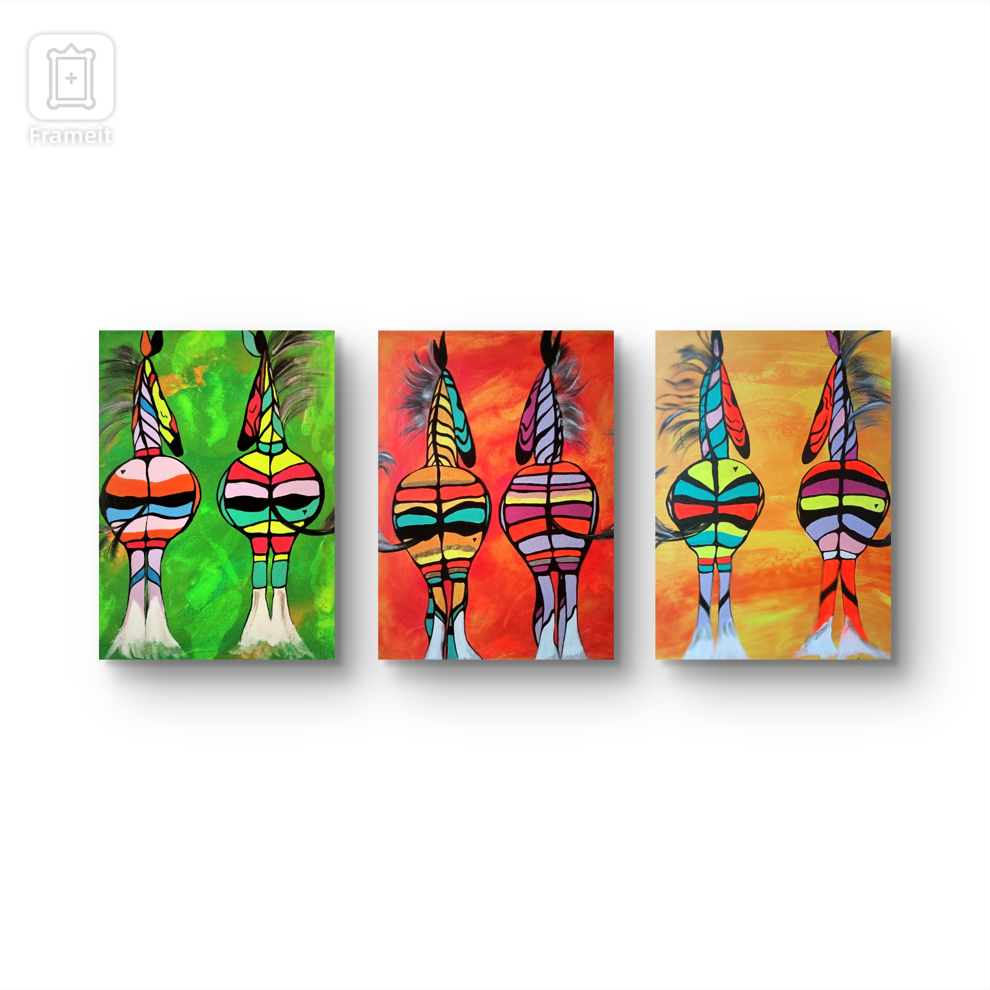 Trzy obrazy wiszą obok siebie, tworząc kolorową feerię, która przyciąga wzrok z daleka. Na każdym z obrazów widzimy dwie zebry, choć nie takie zwykłe. Ich ciała wypełnia explozja kolorów – pomarańczowy, czerwony, zielony, niebieski. Skóra zebry w paski wydaje się niemal tańczyć po płótnie, a każda kreska żyje własnym życiem. Tło każdego obrazu układa się w intensywne barwy – zieleń, pomarańcz, co nadaje całej kompozycji żywego, dynamicznego smaku. Hej mamo, te zebry są magiczne! Atmosfera jest lekka, radosna, jakby ktoś wziął tęczę i namalował ją na safari. Artysta bawił się kolorem i formą, tworząc coś pomiędzy afrykańskim folklorem a współczesnym minimalizmem. Technika jest różnorodna, widoczne pociągnięcia pędzla nadają obrazom energii. Może to wydawać się trochę surrealistyczne, trochę jak sen dziecka. Te obrazy to jak wycieczka do krainy wyobraźni, gdzie zebry zamiast czerni i bieli mają na sobie barwy życia. Kolory te mogą wywoływać uczucie euforii, poczucie beztroski, może nawet zachwytu nad pięknem różnorodności. Wow, these zebras are really something! Obrazy te to jak moment zatrzymany w czasie, gdy rzeczywistość spotyka się z fantazją.