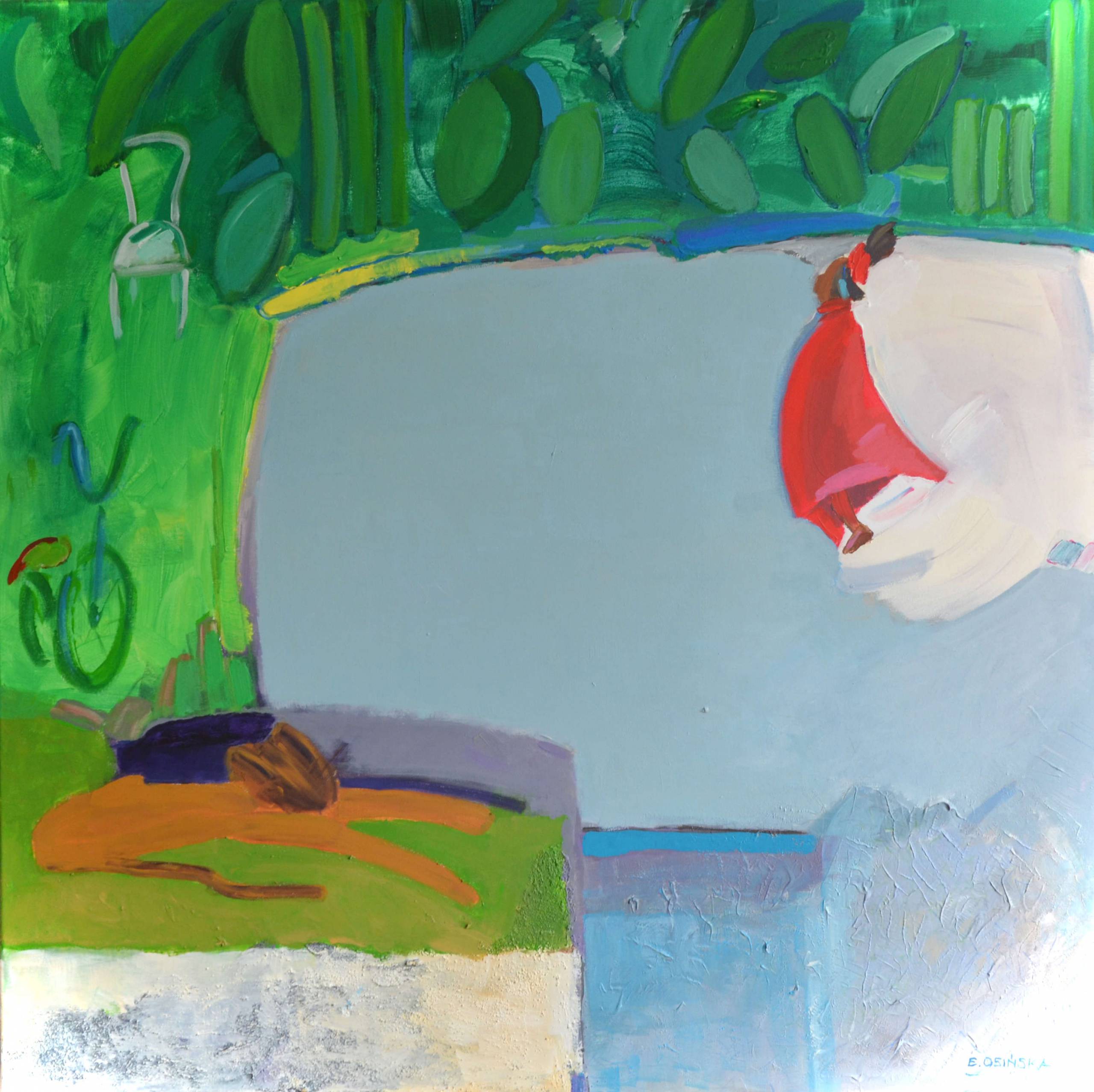 Na obrazie dominują żywe kolory, które od razu przyciągają wzrok. Bogata zieleń kontrastuje z jasnym niebem, które tworzy centralną przestrzeń kompozycji. Po lewej stronie dostrzegamy rower, który wydaje się być swobodnie porzucony na soczystej trawie, a obok niego – krzesło, jakby zapraszające do odpoczynku. Na prawo widać sylwetkę w czerwonej sukience, która tańczy lub unosi się, dodając ruchu i lekkości całej scenie. Ten element emanuje energią, jakby mówił: "Dance like nobody's watching!" Całość ma w sobie coś z dziecięcej beztroski. Obraz, wykonany techniką abstrakcyjną, emituje atmosferę ciepłego, letniego dnia spędzonego na świeżym powietrzu. Przez zastosowanie grubych pociągnięć pędzla i intensywnych kolorów, artysta stworzył dzieło pełne życia i dynamiki. Odbiorca może poczuć się tak, jakby stał na granicy dwóch światów – rzeczywistego i marzycielskiego. Światła i cienie, jak i płynne linie, wywołują uczucie nostalgii za prostymi chwilami. Dzieło przywołuje wspomnienia z dzieciństwa, kiedy to w letnie popołudnia świat wydawał się nie mieć końca. "Ojej, ja też chcę tak polatać!" zawołałoby z pewnością każde dziecko.
