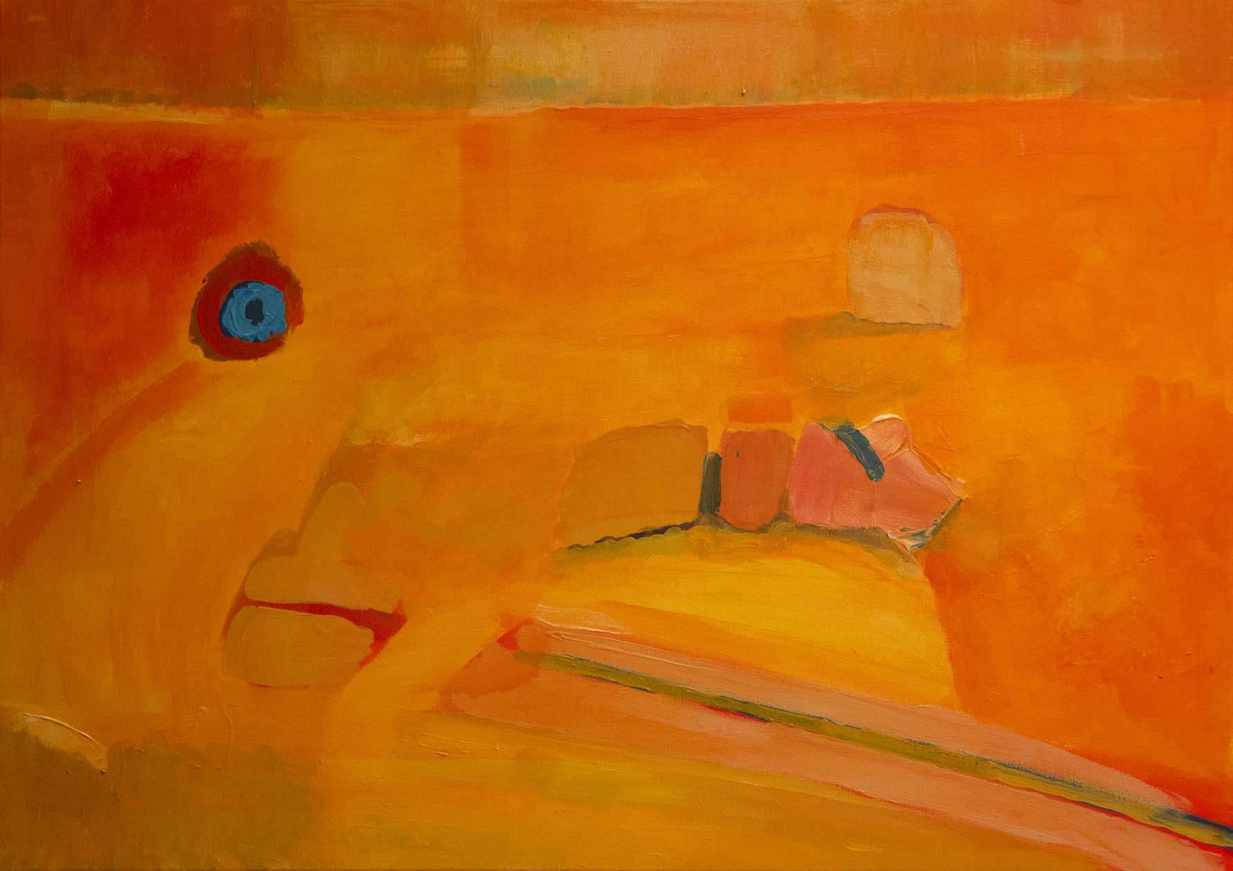 Na tym obrazie dominują ciepłe odcienie pomarańczu i żółci. Intensywność barw sprawia, że wydaje się, jakby płótno promieniowało ciepłem. Na pierwszym planie można dostrzec jaśniejsze plamy, które tworzą nieokreślone formy, możliwe że budynki w skąpym świetle słońca. Intensywnie niebieski okrąg przypomina oko, przerywając monotonię ciepłych barw. Wszystko to przypomina chaos dziecięcych zabaw. Kompozycja jest dość swobodna, jakby malarz po prostu wylewał farby na płótno i obserwował, co z tego wyniknie. Mimo to, jest w tym coś fascynującego! To dzieło, które zdaje się łączyć spontaniczność z artystycznym zamiarem. Technika użyta przez artystę jest niechlujna, ale, you know, idealnie pasuje do ekspresyjnej atmosfery, jaką emanuje z tej kompozycji. To obraz, który niepokoi i zachwyca jednocześnie. Można poczuć radość, zaskoczenie, a może nawet i niepewność. Patrząc na niego, przypominam sobie zabawy z farbami w dzieciństwie. „Maluję słoneczko!” – napisze z dumą 7-latek. Co więcej, mam wrażenie, że obraz emanuje tajemnicą, która zaprasza do refleksji. Co artysta chciał tutaj ukazać? Zastanawiające jest, jak nieokreśloność kształtów i intensywność kolorów mogą wywoływać tyle różnych emocji.