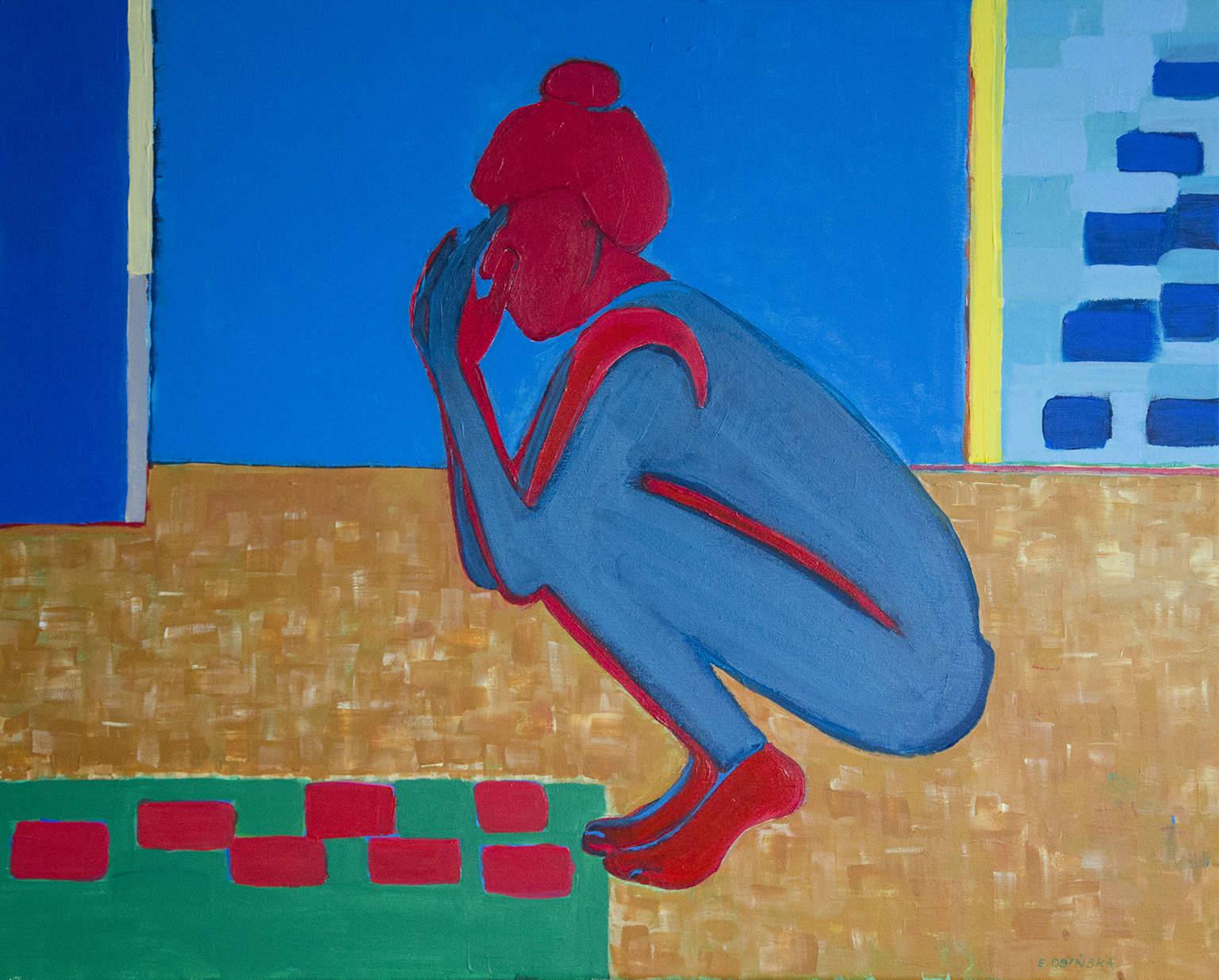 Obraz przyciąga wzrok żywą paletą kolorów. Dominuje intensywny niebieski, kontrastujący z ciepłym żółtym i czerwonym. Na płótnie widoczna jest postać w pozycji kucającej, pokryta odcieniami szarości i czerwieni. Kształty są zgeometryzowane, co nadaje kompozycji pewną abstrakcyjność. Mimo pozornej prostoty, emanuje z niego głęboki nastrój zadumy i refleksji. Artysta zastosował płaskie plamy barw, co przypomina mi nieco dzieła fowistów, takich jak Matisse. Atmosferę dopełniają prostokątne wzory w tle, które mogą przywodzić na myśl architekturę miejską. Patrząc na obraz, można się zastanowić nad uczuciami samotności czy introspekcji, które wywołuje. Coś jakby ktoś się zastanawiał: „Co zrobić dalej?”. Technika zdaje się być malarska, z wyraźnymi pociągnięciami pędzla widocznymi na powierzchni. Moje serce podpowiada mi, że to „cool” sposób na pokazanie emocji. Ktoś może zobaczyć w tym obrazie refleksję nad izolacją w miejskiej dżungli. A ja myślę, że to jak rysunek, który chciałem zrobić w przedszkolu, ale dorośli się nim zachwycali. Ten obraz to coś więcej niż tylko kolory na płótnie. To sztuka, która krzyczy, choć jest cicha.