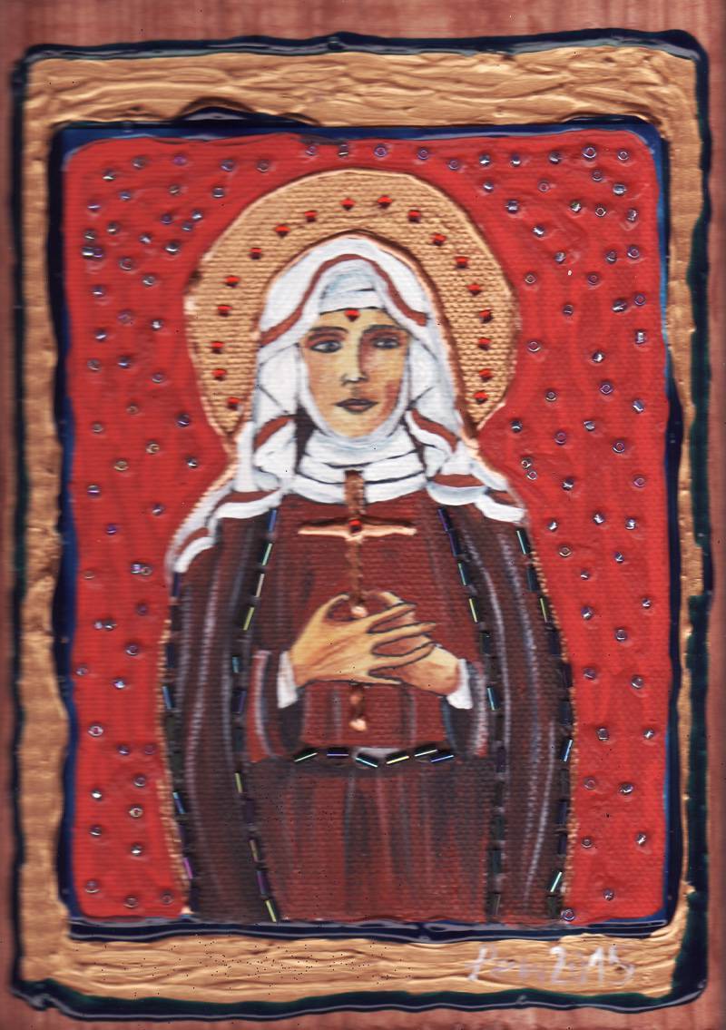 Obraz ukazuje postać świętej, która wyróżnia się na tle intensywnie czerwonego tła. Dominują tu odcienie złota i brązu, które harmonizują z główną postacią, obleczoną w szatę o głębokiej, ciemnej barwie. Ręce postaci są złożone w geście modlitwy, a wokół głowy widnieje nimb, dodający jej duchowego blasku. Kompozycja jest klasyczna i symetryczna, a subtelne detale, takie jak małe, błyszczące kropki, nadają całości nieco magiczną aurę. Artystycznie, obraz nawiązuje do ikon, wykorzystując płaskie perspektywy i wyraziste kontury. Stosowane techniki mieszają fakturę farby z delikatnymi akcentami rysunku, co dodaje temu dziełu głębi i ekspresji. Atmosfera obrazu jest spokojna, pełna skupienia i duchowej kontemplacji. Można poczuć, że czas tu zwalnia, a jednocześnie bucha ciepło. Dziecko mogłoby powiedzieć: "Podoba mi się ten złoty kółko na głowie pani". Obraz może budzić w odbiorcy poczucie wewnętrznego spokoju, sugerując duchową podróż lub moment refleksji. Każdy detal zdaje się opowiadać historię, a "halo" wokół głowy przyciąga wzrok swoim świętym blaskiem. Obserwując ten obraz, czuję jakbym siedział w cichym kąciku kościoła, gdzie wszystko ma sens. Gdzie duchowość łączy się z artystycznym wyrazem. Wow.