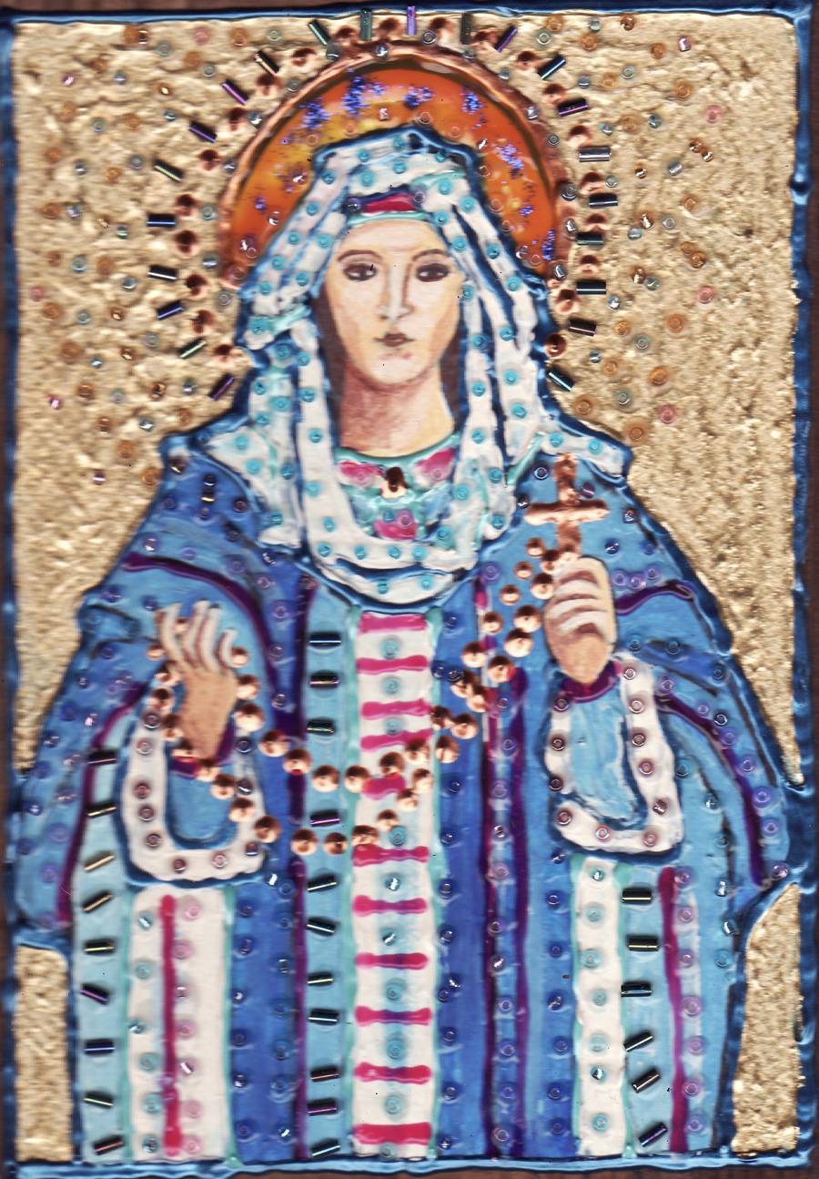Obraz emanuje spokojem i duchowością, przyciągając wzrok bogatą paletą kolorów. Dominują tu odcienie błękitu i złota, które tworzą wyrazisty kontrast, nadając postaci centralnej głębię i majestatyczność. Kompozycja jest zharmonizowana, z wyraźnym naciskiem na symetrię. W centrum widzimy postać w błękitnych szatach, ozdobioną koralikami, które wyglądają jak gwiazdy rozświetlające nocne niebo. To wszystko sprawia, że całość wydaje się niemal magiczna. Atmosfera jest pełna spokoju, prawie słychać ciche szepty modlitwy. Techniką dominującą zdaje się być technika mieszana, łącząca tradycyjne malarstwo z elementami kolażu. Artysta, nie bojąc się eksperymentów, osiąga efekt dostojeństwa, który sprawia, że obraz wydaje się być zarówno nowoczesny, jak i zachowawczy. Wpatrując się w ten obraz, można poczuć wzruszenie, jakby z postaci emanowała magiczna aura ciepła i miłości. Obraz jest jak baśń, w której każda nitka błękitu ma swoją historię do opowiedzenia. Dla siedmioletniego dziecka obraz może przypominać tajemniczą księżniczkę z bajki. Tak, jakbyśmy patrzyli przez otwarte okno do innego świata, pełnego innych zasad, spokoju i nadziei. Trochę jak magic!