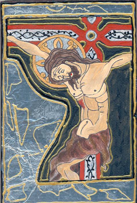 Na obrazie dominuje dramatyzm, który widać w subtelnej, aczkolwiek mocnej kompozycji kolorów i kształtów. W centrum widzimy postać ukrzyżowaną, której ciało przyciąga uwagę swoją skomplikowaną grą światła i cienia. Czerwień i złoto tła dodają obrazowi głębi i niemalże boskiego blasku, kontrastując z ciemnym tłem, które nadaje dziełu tajemniczości. Skomplikowane wzory zdobiące brzeg obrazu przyciągają oko, nadając mu charakteru i historycznego klimatu. Atmosfera jest ciężka, a zarazem medytacyjna. Obraz promieniuje spokojem, mimo swej dramatycznej natury. Styl, można powiedzieć, nawiązuje do średniowiecznego iluminatorstwa z precyzyjnymi pociągnięciami pędzla i wyważoną kolorystyką. Artysta używa technik, które wydobywają z płótna emocje i głębokie przesłanie – niemalże można poczuć poruszenie, jakie wywołuje patrząc na dzieło. Patrząc na obraz, człowiek może zastanowić się nad cierpieniem i ofiarą. Dla mnie, jako odbiorcy, przywodzi na myśl refleksję nad ludzką kondycją i sensem poświęcenia. Aż chce się zawołać – wow! To jest coś. Myślę, że nawet takie "wow" wystarcza, by opisać emocje. Obraz przyciąga wzrok swoją "ancient" aurą, stawiając przed widzem pytania o przeszłość i wpływ obrazów na nasze dzisiejsze życie. W końcu ma się wrażenie, że ta praca, mimo swojej wiekowej stylistyki, mówi do nas w sposób bardzo współczesny. A dziecko może powiedzieć: O rety, to jest Jezus na krzyżu! I to też jest piękne.