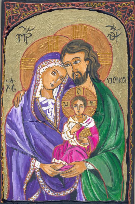 Oto niezwykle pełen detali obraz rodzinnej sceny, na którym dominują ciepłe odcienie złota, purpury i zieleni. Postacie są przedstawione w harmonijnej kompozycji, jakby tworzyły wspólną całość, co dodaje im jednocześnie dostojności i bliskości. Złote aureole wokół głów postaci emanują światłem i tworzą aurę świętości, która przenika całą kompozycję. To jak być w innej epoce, wiecie, takiej pełnej spokoju. Atmosfera obrazu emanuje spokojem i delikatnością. Użyto technik charakterystycznych dla sztuki ikonicznej, z grubymi liniami i płaskimi kolorami, które dodają mu tradycyjnego smaku. Może nie jest to typowy styl artystyczny współczesnych dni, ale i tak trudno oderwać od niego wzrok. Kijk Daddy, it’s shining! Czuję, że ten obraz może wywołać uczucie ciszy i refleksji. To dzieło ma coś, co przyciąga – jakby mówiło, "zatrzymaj się na moment i poczuj ten magic" – magic, który odczuwam całym sercem. Takie dzieło, które chce się mieć przy sobie w domu, prawda?