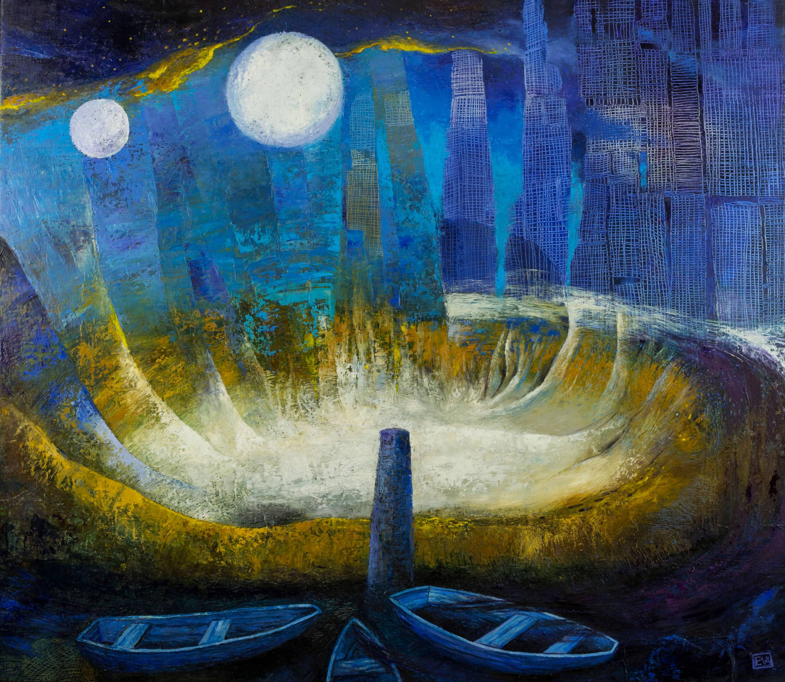 Obraz olejny, pejzaż fantastyczny, odrealniony, utrzymany w chłodnej gamie kolorystycznej, z przewagą błękitów.