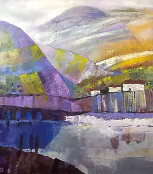 Obraz olejny, łodzie na wodzie, pejzaż odrealniony