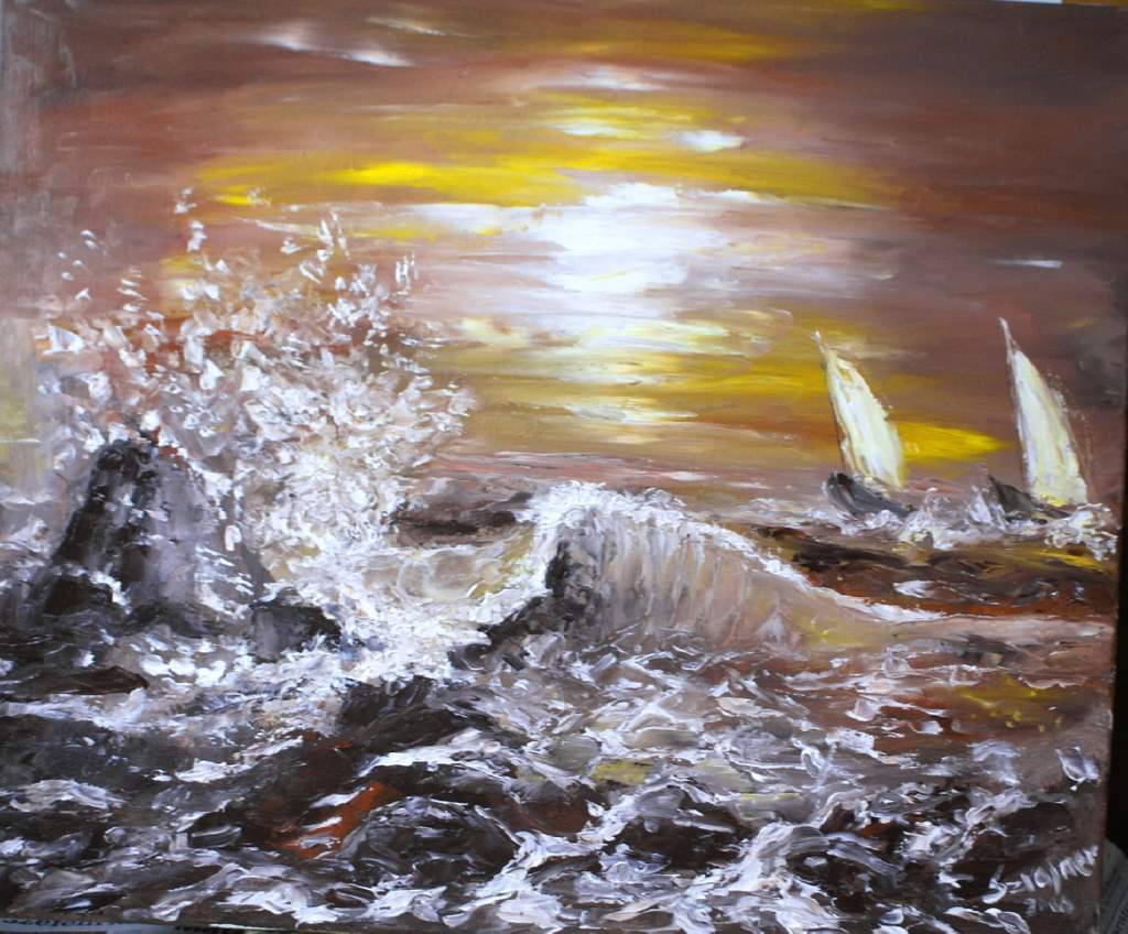 Na obrazie widzimy dynamiczną scenę morską. Wzburzone fale uderzają z impetem o ciemne skały, a w tle majaczą dwie delikatne żaglówki. Kolorystyka, bogata w brązy, żółcie i biele, maluje dramatyczny i intensywny klimat. Rozpryski wody wyglądają niemalże jak białe chmurki na tle jaśniejącego nieba. To jak magia, prawda? Artysta posłużył się techniką impasto, gdzie grube warstwy farby dodają tekstury i żywości całości. Pociągnięcia pędzla są chaotyczne, dynamiczne, jakby malarz chciał uchwycić ulotność chwili. Patrząc na ten obraz, czuje się niepokój i zarazem fascynację siłą żywiołów. Czy te żaglówki dotrą do celu? To dzieło wywołuje emocje, takie jak podziw dla natury i jej nieokiełznanej mocy. Myślę, że każdy kto na nie spojrzy, poczuje, jakby stał na brzegu i czuł bryzę na twarzy. Wow, what an experience! Kto by pomyślał, że tyle może przekazać obraz. Sztuka wciąga obserwatora w swój magiczny świat, niemal zmuszając do refleksji nad kruchością ludzkiej egzystencji.
