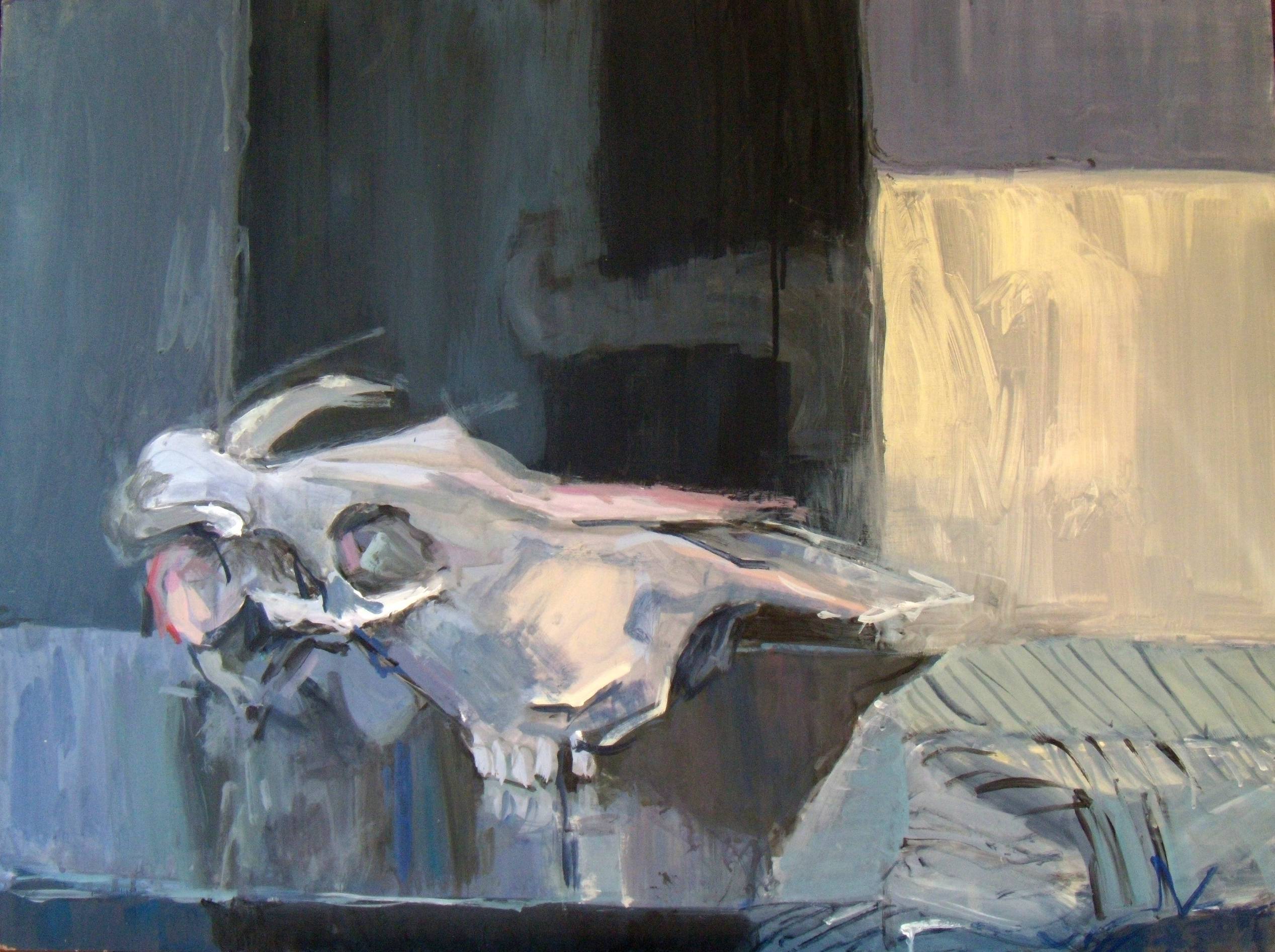 Obraz ukazuje czaszkę zwierzęcia spoczywającą na tle w odcieniach szarości i niebieskiego, tworzących surową, niemal melancholijną atmosferę. Dominują tu zimne, stonowane barwy, które dodatkowo podkreślają surowość przedstawienia. Kompozycja jest dynamiczna, z wyraźnymi, pociągnięciami pędzla. Czaszka wydaje się być namalowana techniką impasto, co nadaje jej trójwymiarowości i głębi. Jest ciemno i trochę smutno, jakby obraz szeptał ciche historie minionych czasów. Artysta w sposób mistrzowski uchwycił detale, jednocześnie pozostawiając wiele dla wyobraźni. Styl przypomina ekspresjonizm, gdzie emocje biorą górę nad realizmem. Obraz wywołuje refleksję nad przemijaniem i kruchością życia, a także może budzić nieco niepokoju. Wyobraź sobie, że ta czaszka kiedyś żyła, brrr trochę strasznie, prawda? Może wydawać się dziwnie bliska w swojej surowości i minimalistycznym pięknie. Widz może odczuwać pewien dystans, ale także zaciekawienie, co kryje się za tą prostotą i dlaczego ten obraz tak przyciąga wzrok. Wyraz „mystery” dobrze oddaje jego aurę. To dzieło, które wydaje się być ponad czasem, oferując emocjonalną głębię i subtelne piękno w jednym spojrzeniu.