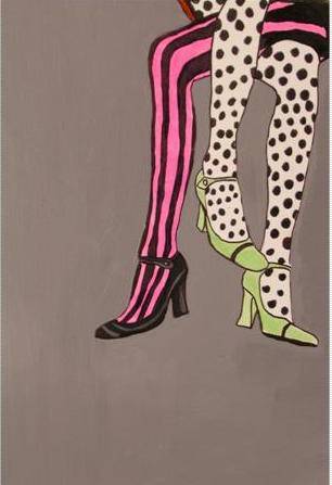Na obrazie mamy tło w stonowanym, szarym kolorze, a na jego pierwszym planie wyróżniają się trzy pary damskich nóg, każda w innej, przyciągającej wzrok stylizacji. Po lewej stronie widzimy nogi w rajstopach w różowe paski, które kontrastują z czarnymi wysokimi obcasami. Pośrodku znajduje się para nóg ubranych w czarno-białe kropki, co wprowadza element trochę retro do kompozycji. Trzecia para nóg, po prawej, ozdobiona jest jasnozielonymi butami, które dodają całości świeżości i nowoczesnego twistu. Atmosfera obrazu jest pełna energii i lekkości, jakby właśnie wpadł do pokoju przypływ letniej imprezy. Artysta zastosował wyraziste kolory i proste kształty, co sugeruje styl pop-art, znany z dynamiczności i prostoty formy. Ta praca na pewno może wywoływać różne emocje - jednych może zachwycić swoją żywiołowością, innych może przenieść w czasy szalonych lat 60. Stylizacja nóg przyciąga uwagę, niczym dobra melodia, która długo zostaje w głowie. Wydaje mi się, że obrazy tego rodzaju potrafią także wzbudzić uśmiech jako wyraz nieformalnego podejścia do sztuki. Wow, so cool - ktoś mógłby pomyśleć, widząc te kolorowe detale. Co ciekawe, pięciolatek mógłby powiedzieć: "Lubię te zielone buty, są jak trawa!" Obraz pozostawia miejsce na interpretacje i zachęca do własnych przemyśleń.