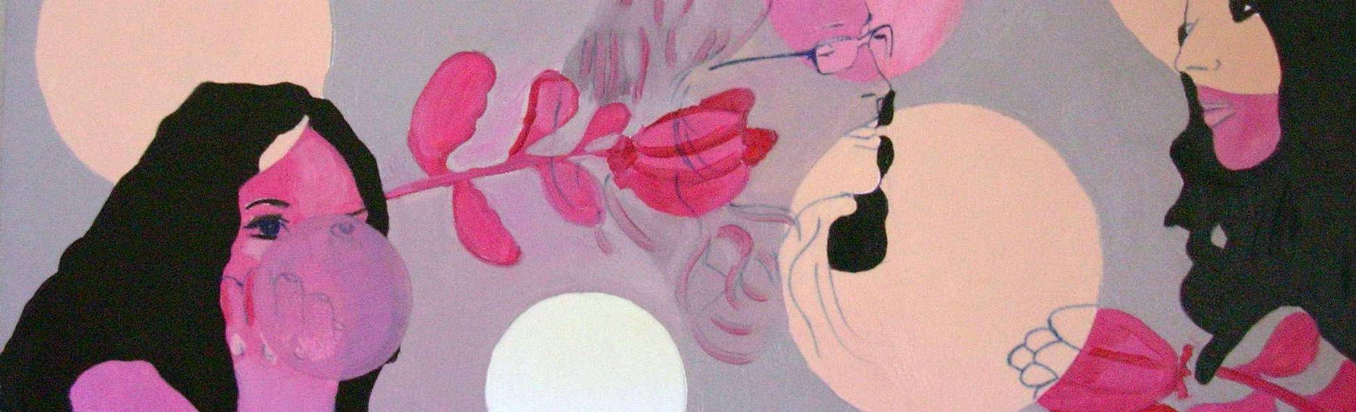 Na przedstawionym obrazie dominuje delikatność i subtelność. Pastelowe kolory różu i szarości tworzą harmonijną kompozycję, w której kształty przenikają się nawzajem, tworząc atmosferę pełną spokoju i refleksji. Duże, okrągłe formy przypominają bańki mydlane, które unoszą się w powietrzu, nadając całości lekkości i ulotności. W centrum uwagi znalazły się postacie, których twarze wyłaniają się zza kulistych kształtów. Są one osadzone w delikatnych tonach, co dodaje im ulotności, jakby były częścią snu. Styl tego dzieła jest nieco dreamlike, niemal surrealistyczny, a technika nawiązuje do uproszczonych, niemal dziecięcych kreskówek. Kontury są wyraźne, podkreślone prostymi liniami. Artysta zbudował kompozycję w sposób przemyślany, ale także z nutą swobody, dając odbiorcy przestrzeń do własnych interpretacji. To dzieło może wywoływać u odbiorcy różne emocje. Od odczucia beztroskiej zabawy, przypominającej dzieciństwo, po nostalgiczne refleksje o ulotności chwil. Patrząc na obraz, można poczuć się jak małe dziecko, które puszcza bańki mydlane w słońcu. Osobiście, obraz ten wydaje mi się nie tylko wizualną ucztą, ale także zaproszeniem do zanurzenia się w marzeniach. Refleksja nad tym, jak każdy z nas widzi inaczej, sprawia, że dzieło to pozostaje żywe w pamięci na dłużej.