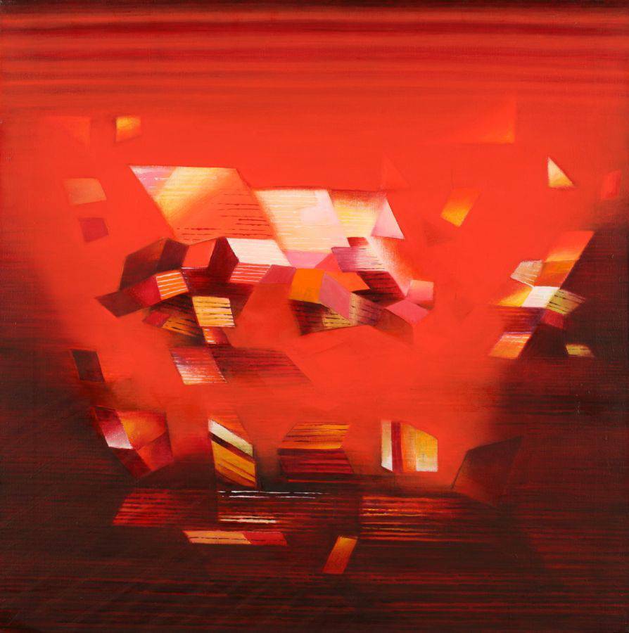 Na obrazie dominuje intensywny odcień czerwieni, który przechodzi od głębokiej purpury na krawędziach do jaśniejszych, niemal płomiennych tonów w centrum. Geometryczne kształty, jakby unoszące się w powietrzu, przywodzą na myśl rozrastające się kryształy lub abstrakcyjne fragmenty światła. Kompozycja jest dynamiczna, chociaż nie przeładowana, co dodaje jej harmonii. Artysta zastosował technikę layering, co wprowadza wielowymiarowość. Całość wygląda trochę jak dynamiczny taniec w dreamlike krainie. Patrząc na to, czuję ciepło i energia, które wypływają prosto z płótna. Obraz emanuje energią i ruchem. Jakby te kształty miały zaraz wyskoczyć z płótna. Jest coś w tym wszystkim bardzo spontanicznego i nieco chaotycznego, jakby artysta chciał uchwycić chwilę niepokoju, ale i fascynacji. Czuję się, jakbym stał na krawędzi wulkanu. Siedmioletni chłopiec mógłby powiedzieć: "To wygląda jak statek kosmiczny lecący przez ognistą galaktykę!". Te abstrakcyjne formy można interpretować na wiele sposobów. Może to prowadzić do refleksji nad tym, jak postrzegamy świat wokół nas, pełen nieprzewidywalności i piękna.