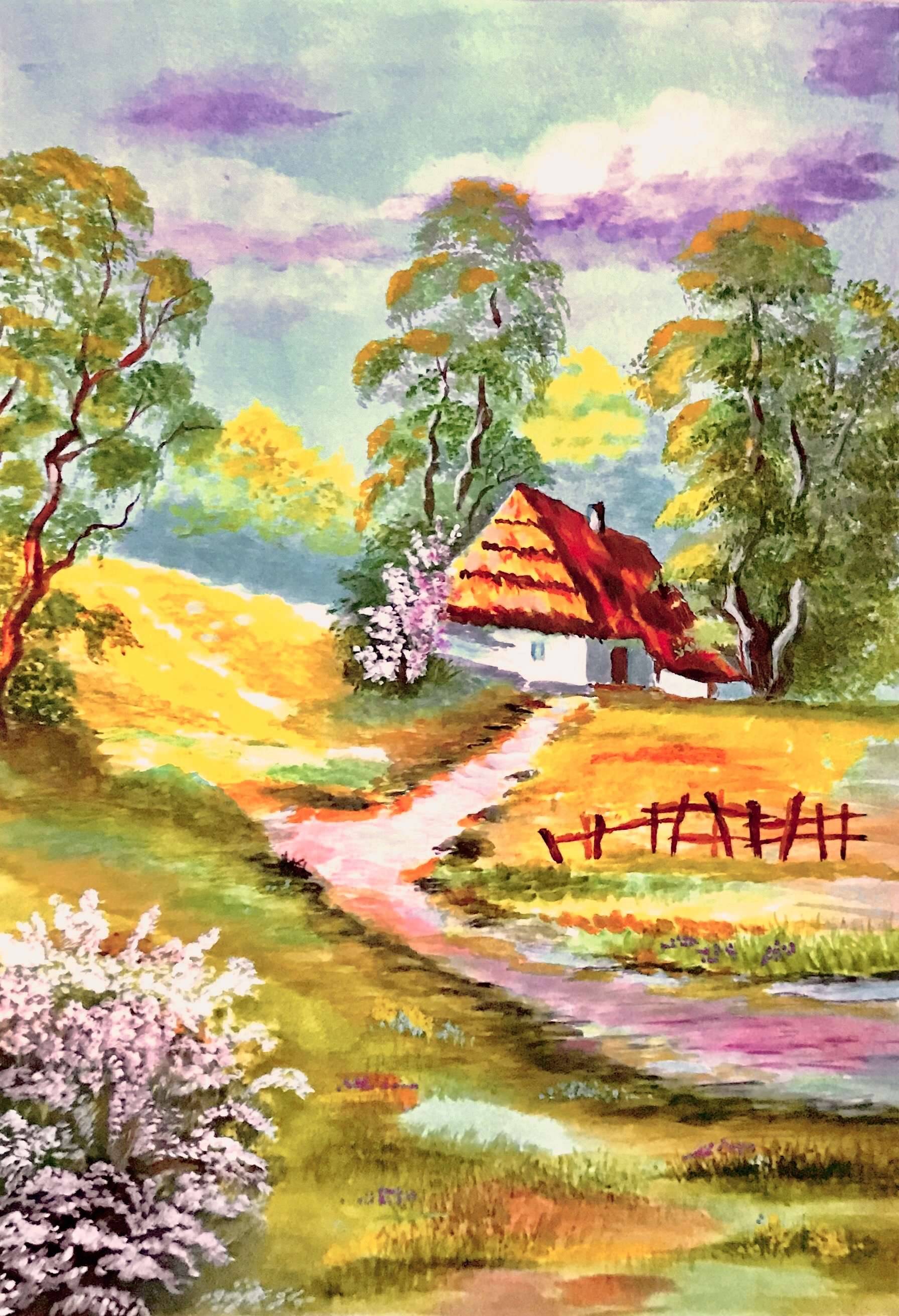 Piękna, unikatowa akwarela, przedstawiająca wiejski klimat, chatę krytą strzechą położoną w malowniczym miejscu, wśród zbóż i lasów. Wykonana w stylu realistycznym, który zachwyca bogactwem detali, czystą żywą barwą i starannością wykonania. Obraz pasujący do pomieszczenia z klimatem, jaki sam w sobie stanowi. Można stworzyć kolekcje tematyczną zapoznając się z resztą moich prac na: www.sklepzobrazami.com.pl