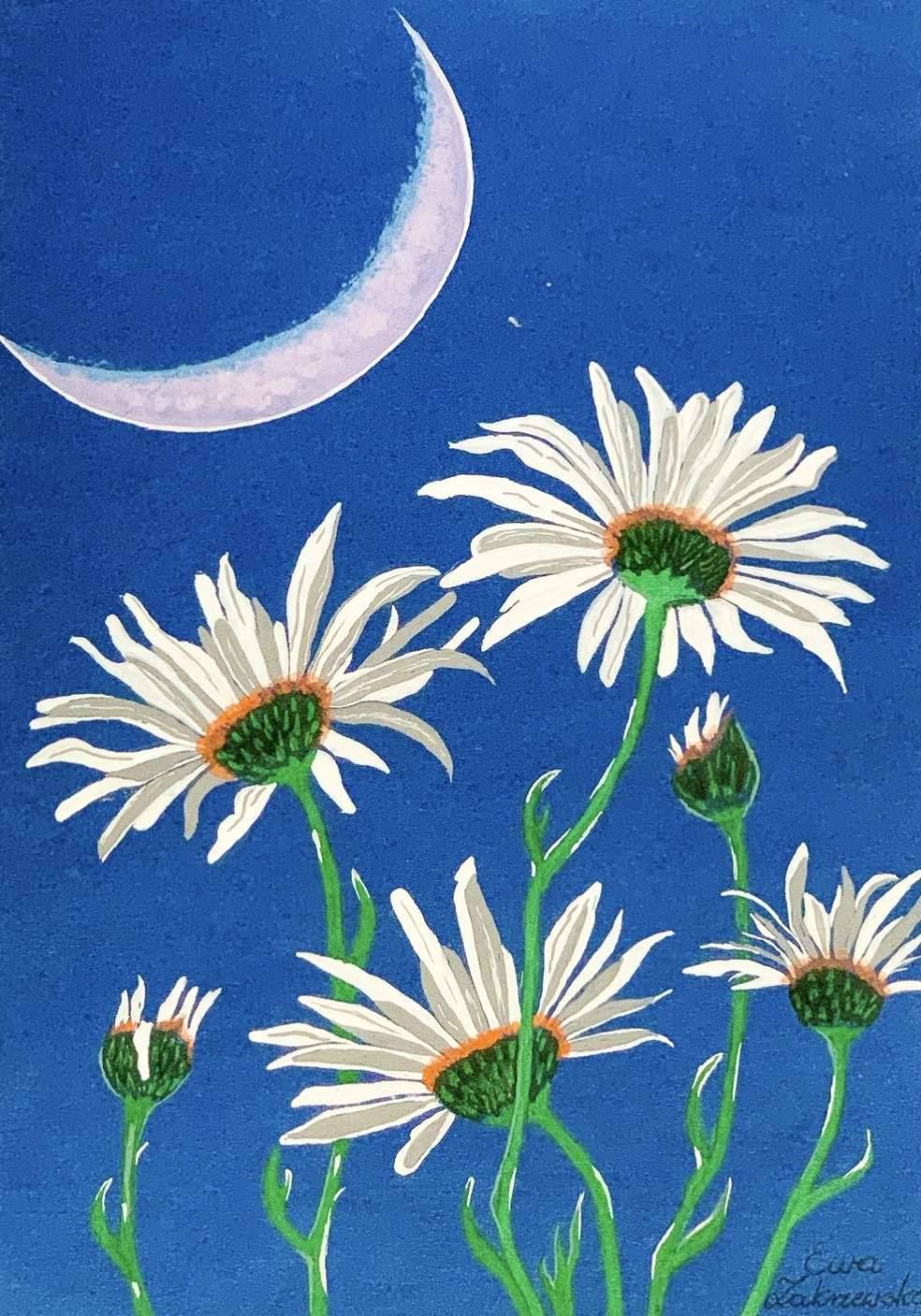 Piękna, unikatowa akwarela, przedstawiająca margaretki na granatowym tle. Malowana w stylu realistycznym, który zachwyca bogactwem detali, czystą żywą barwą i starannością wykonania. Obraz pasujący do pomieszczenia z klimatem, jaki sam w sobie stanowi. Można stworzyć kolekcje tematyczną zapoznając się z resztą moich prac na: www.sklepzobrazami.com.pl