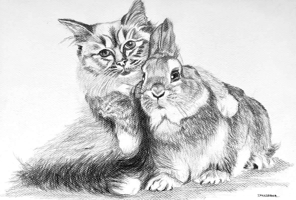 Praca wykonana ołówkiem, przedstawiająca dwóch przyjaciół kotka i królika. Można stworzyć kolekcje tematyczną i zapoznając się z resztą moich prac na: www.sklepzobrazami.com.pl